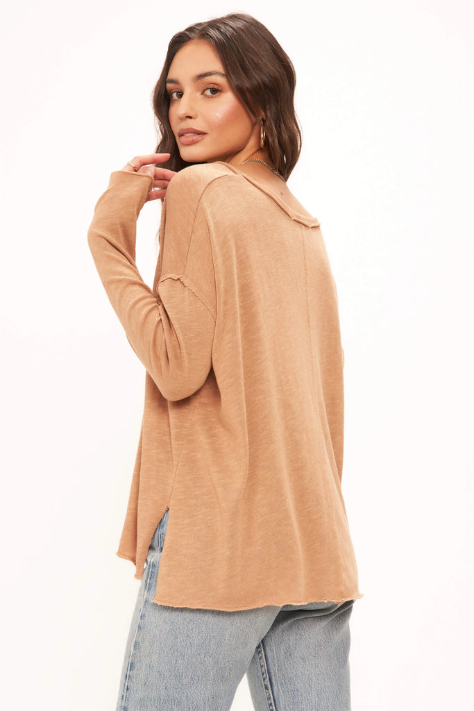 The Mae Textured Relaxed V-Neck Long Sleeve features our signature textured fabric that you all know and love. The soft v-neckline, drop shoulders, side slits, raw hem details, and overall draped fit create a casual, effortless staple. Pair with jeans, heels, and a cute bralette underneath for mid-week happy hour.