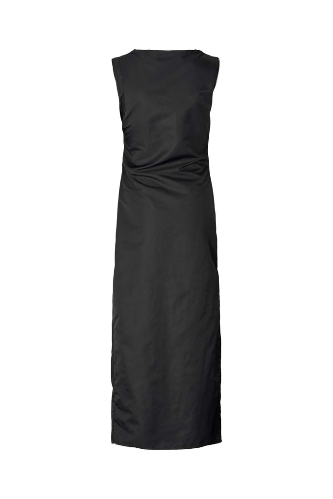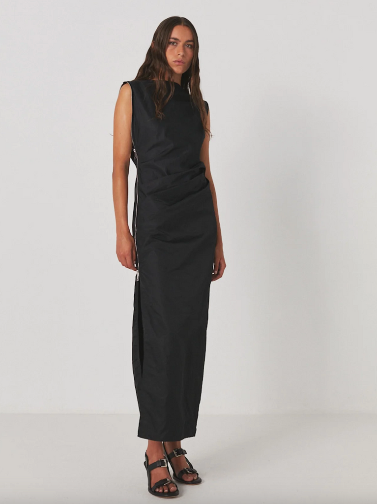 Crafted from a lightweight recycled fabric, the long nylon dress is defined by a most flattering, feminine silhouette highlighting the figure. The design stands out with a sleek zipper detail featured on the right side of the dress letting you play with the length of the slit for a more or less daring appeal. It has pleated waist details, straight shoulders, and a feminine boat neck.