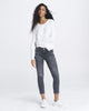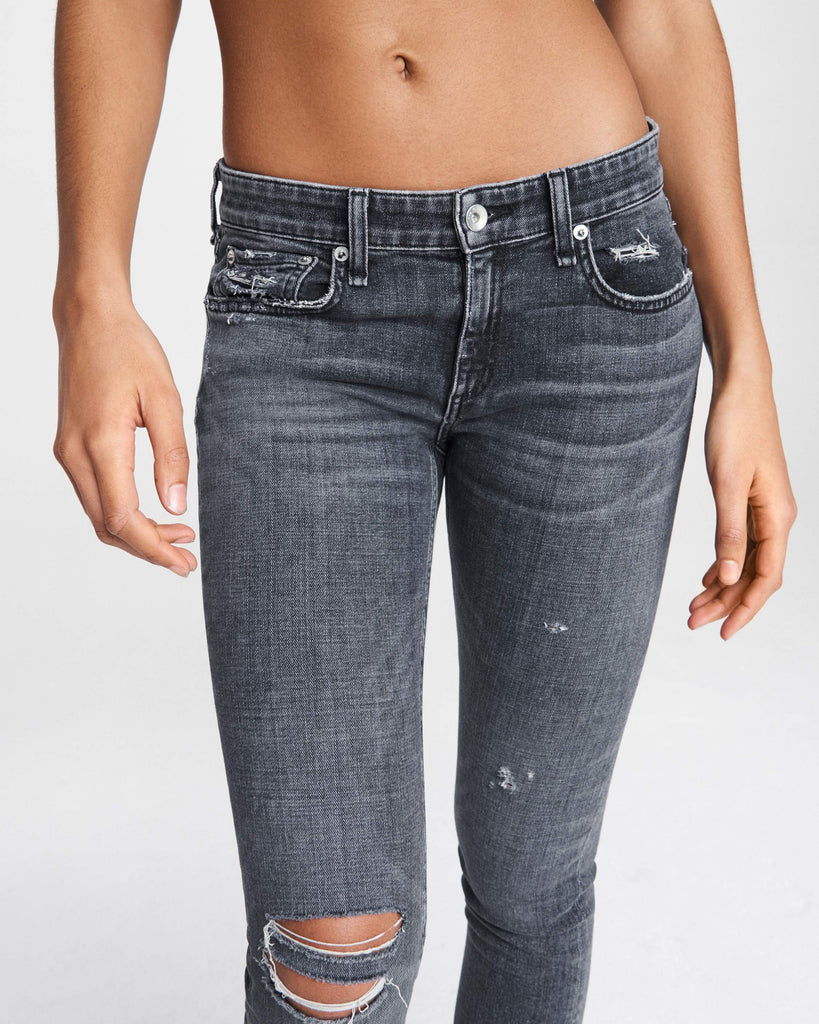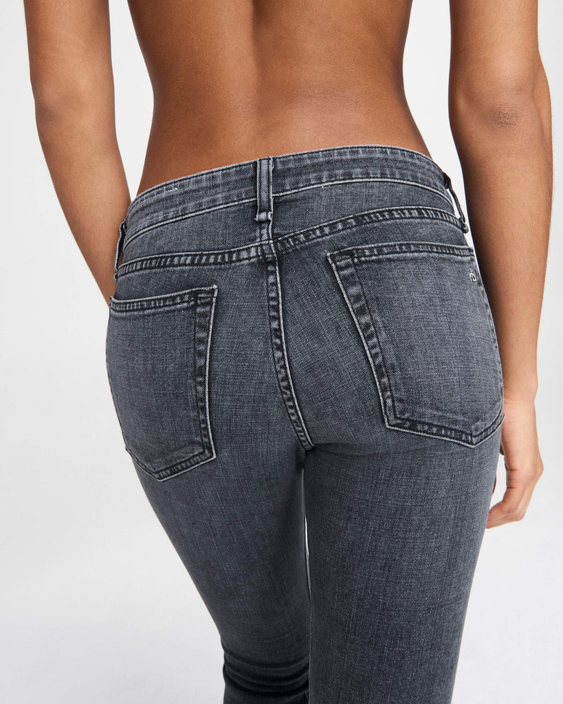 Classic donut shank button, washer rivet, zipper fly, eggshell rb embroidery with clean finished hem