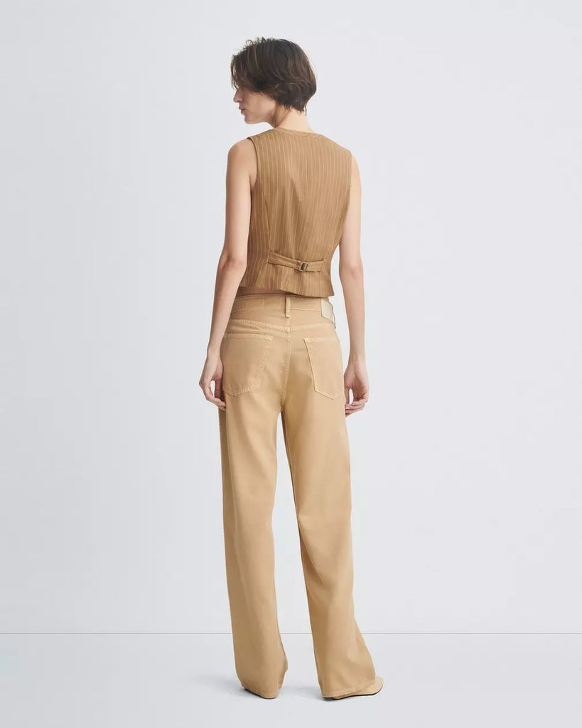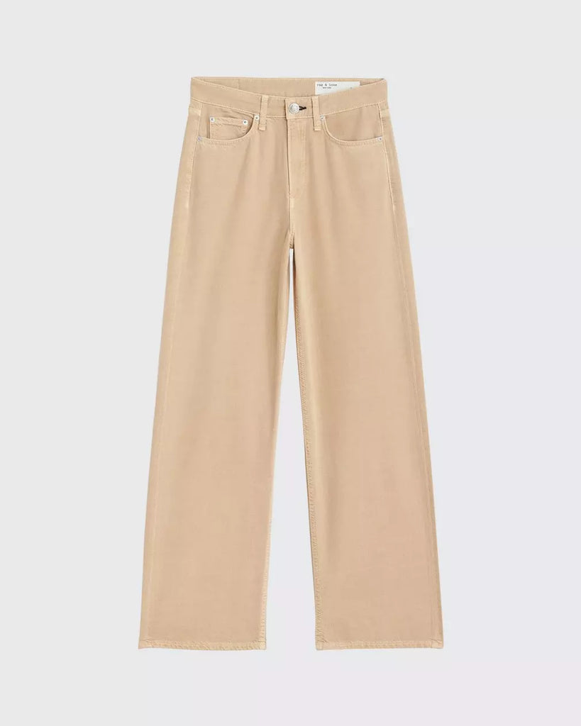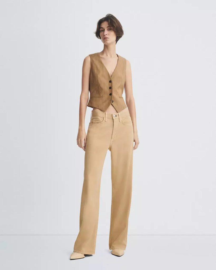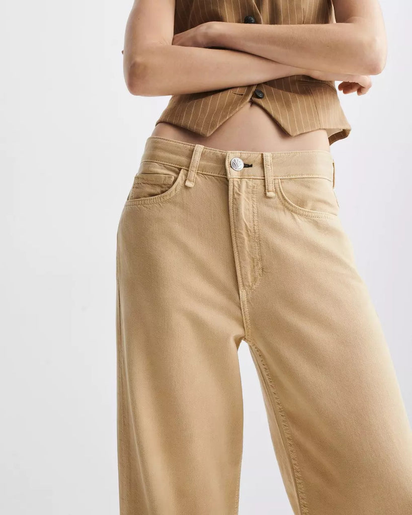 The Logan. A wide-leg jean that feels like an exhale. Crafted in Featherweight denim with a relaxed fit. In beige. Pro tip: take your natural size and wear low on your waist for a relaxed look or size down for a higher rise.