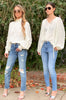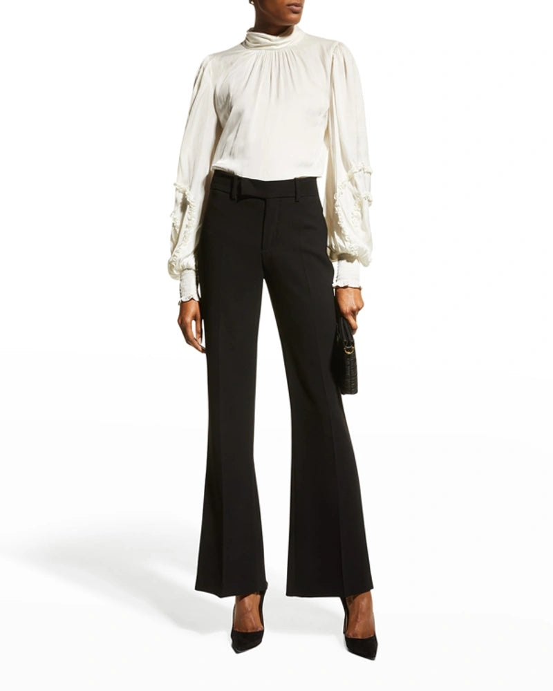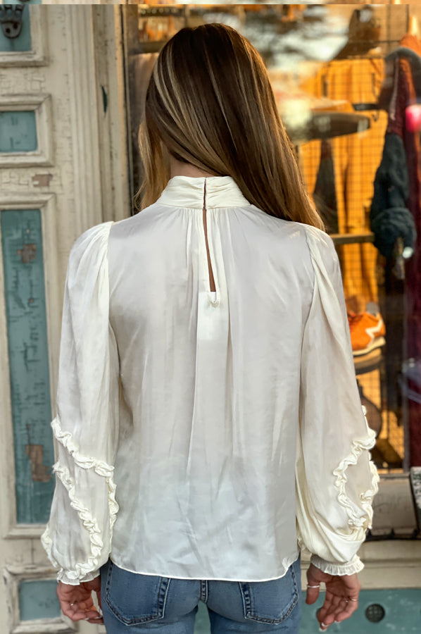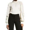 A high neckline and ruffled blouson sleeves lend regal elements to a graceful blouse finished with smocked cuffs and a keyhole cutout at the nape.
