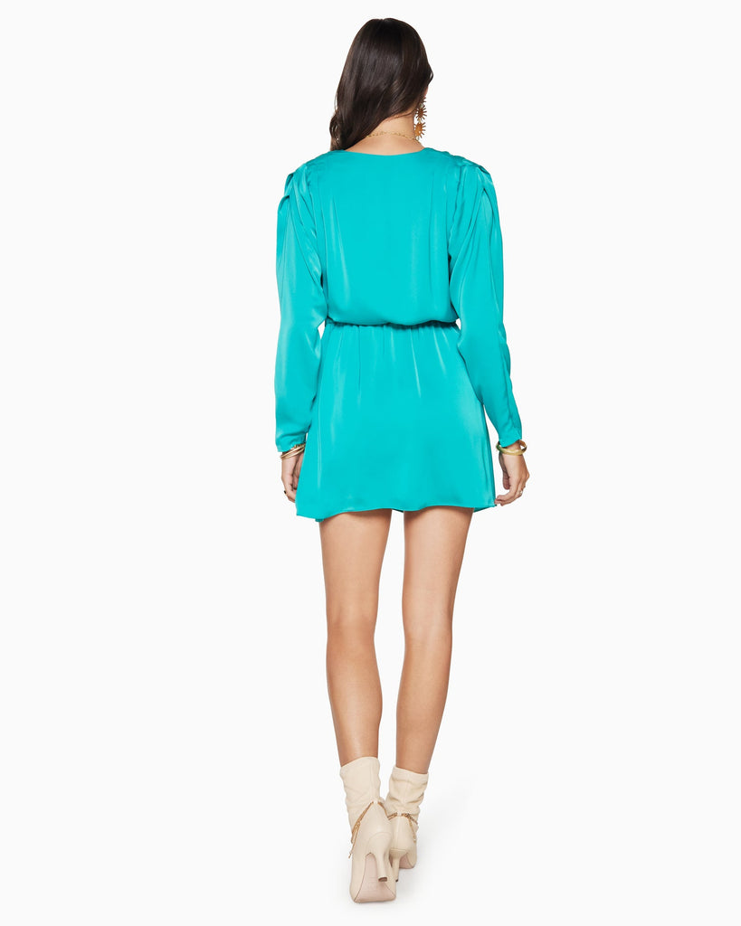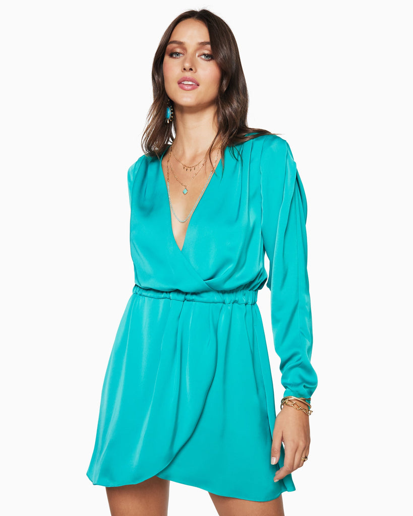Everyone needs an iconic wrap-style dress like the Jayda dress in their outfit options. Crafted from our satin charmeuse fabric and complexion-enhancing oasis colorway, this long sleeve dress is complemented by a waist-flattering cinch belt. Just add your favorite ankle booties or strappy sandals, and you'll steal the spotlight at every evening plan.