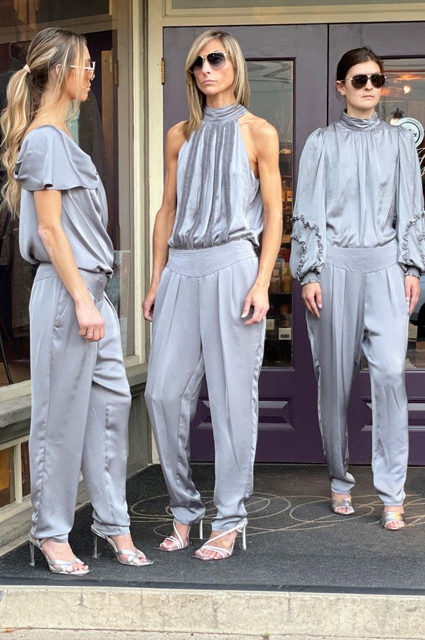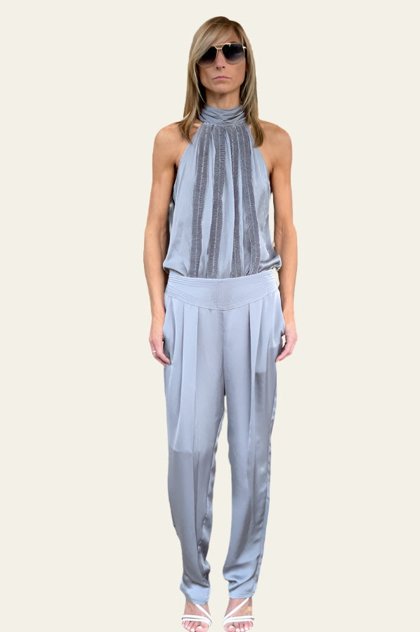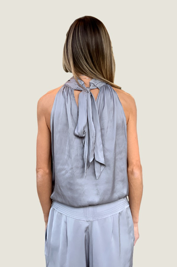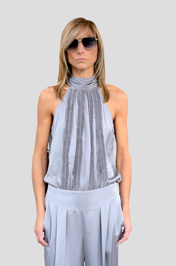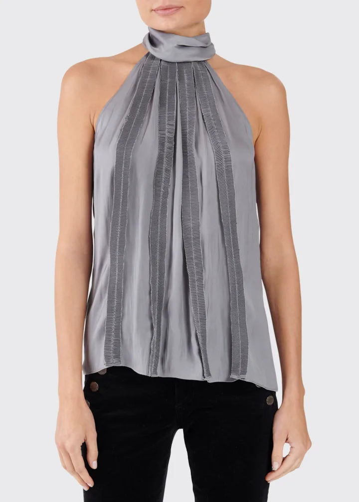 This glossy, high-neck halter features ribboning that radiates from collarbone and nods a dapper tuxedo, making it absolutely perfect for your next cocktail hour or dinner party.
