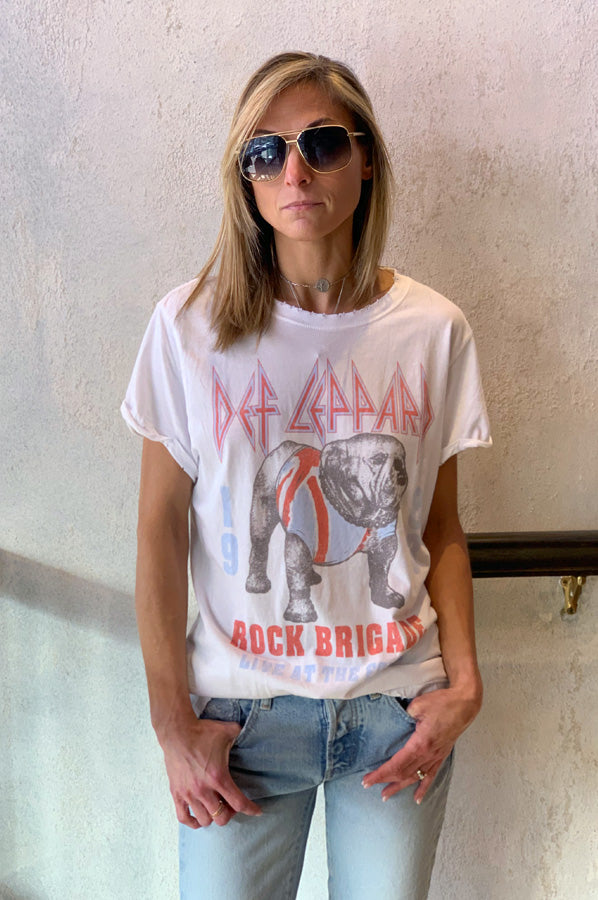 Live for rock ‘n’ roll! A vintage-inspired Def Leppard Rock Brigade tee that is made from super soft cotton with a ribbed crewneck, rolled up sleeves, and a slimmer fit. Features Def Leppard bulldog with Union Jack on the front, and band graphics on the back.