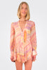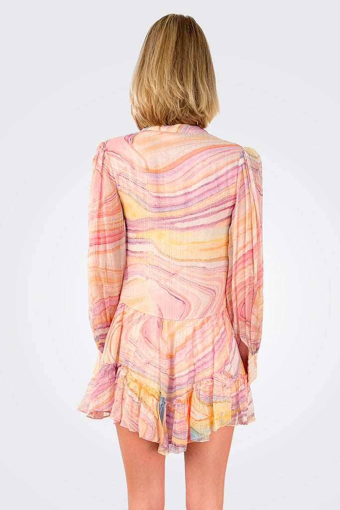 - Eira Mini Dress In Peach And Lilac With Split Neckline, Metallic Striping, Button Cuffs And Ruffle Hem