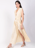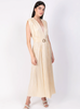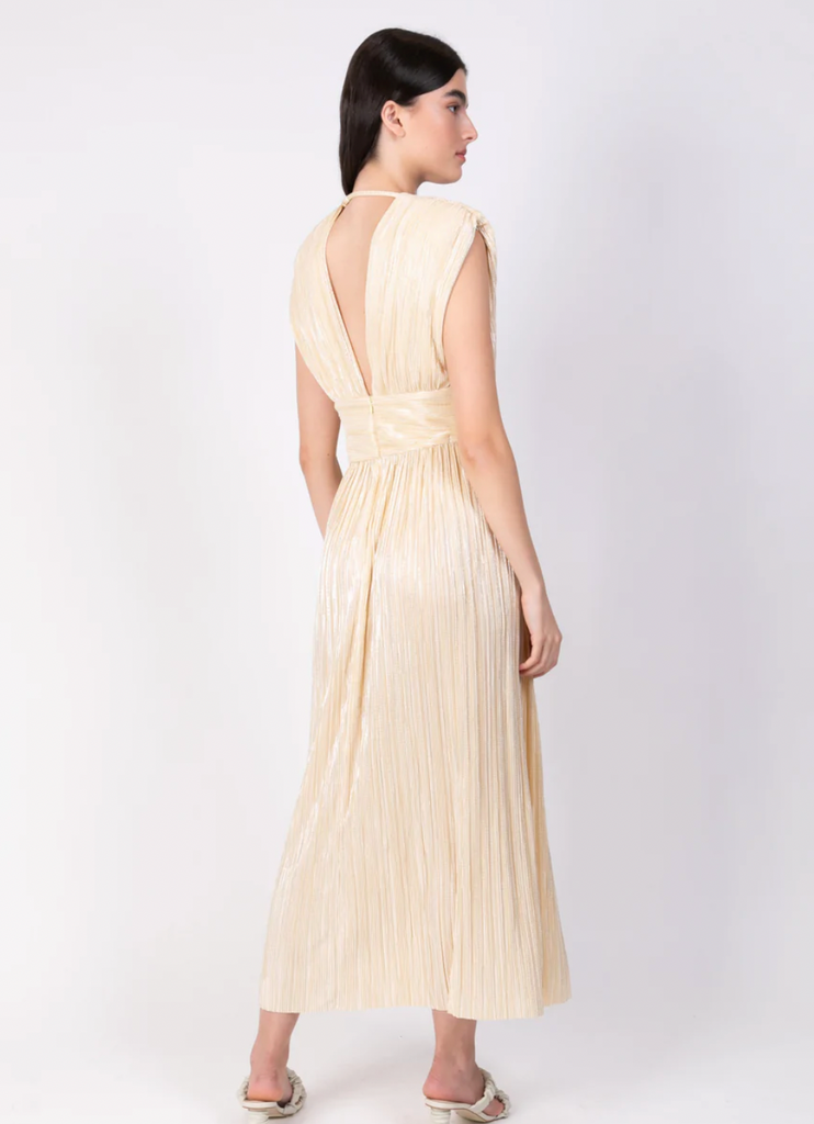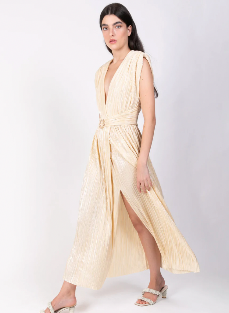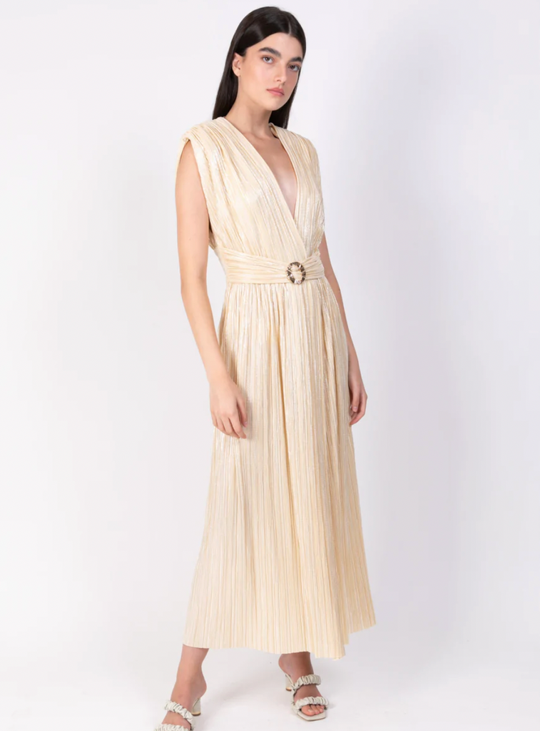 Pleated knit with foil v-neck dress with shoulder pads, side slit, and connected belt with a golden buckle