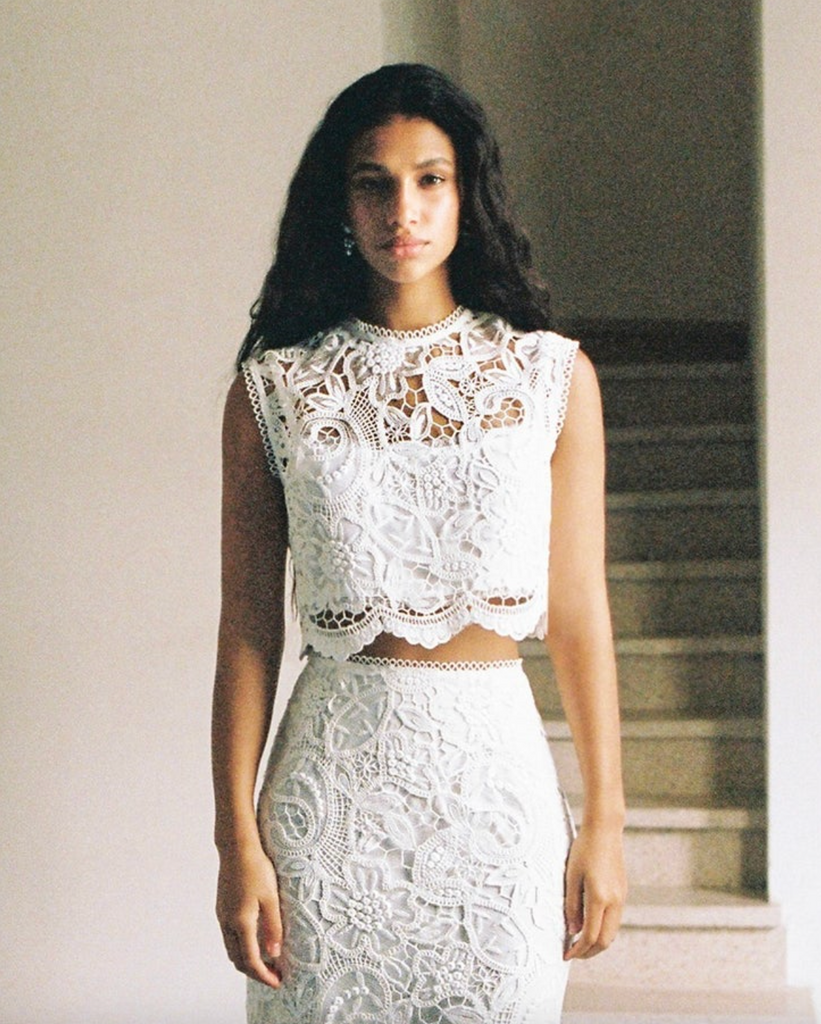 Lace sleeveless crop top featuring a round neckline.