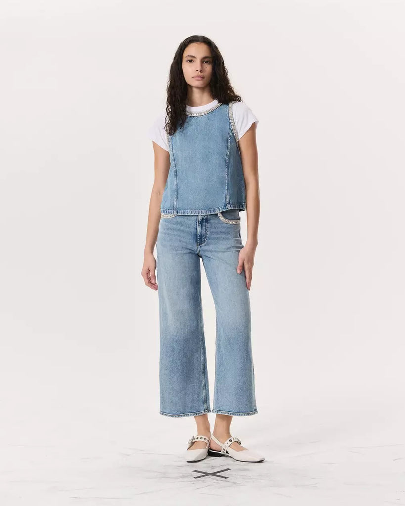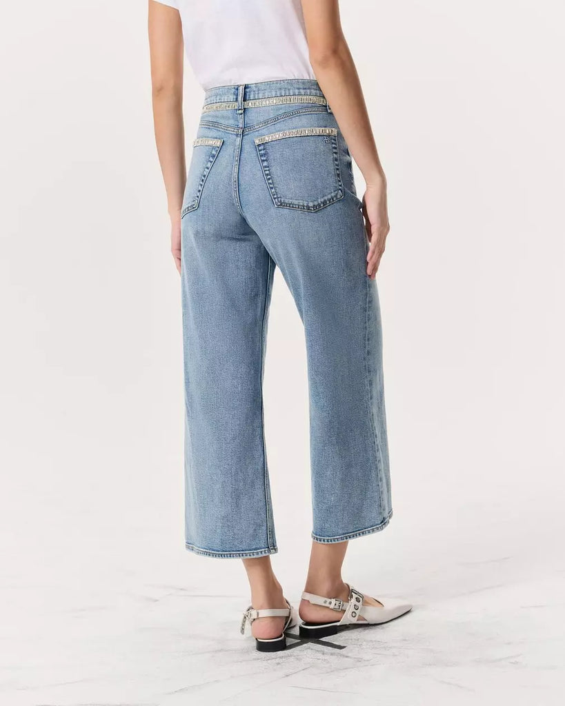 The Andi. High-waist jeans with a wide, cropped leg that hits at the ankle. Crafted from our Vintage Stretch denim for a timeworn look with added comfort. In Pacific Jewel, a light-medium indigo wash embellished with hand-sewn round- and baguette-cut crystals at the pockets and waist.