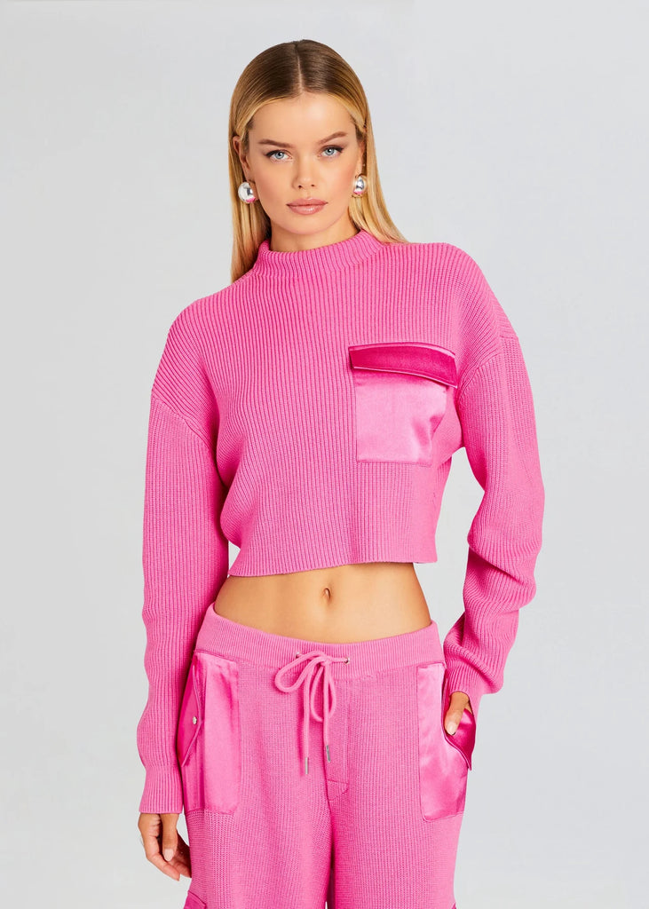 Complete your wardrobe with comfort in SER.O.YA's Donna Sweater. This clean cut sweater comes with a satin front pocket.  Shown here in Malibu Pink.