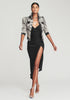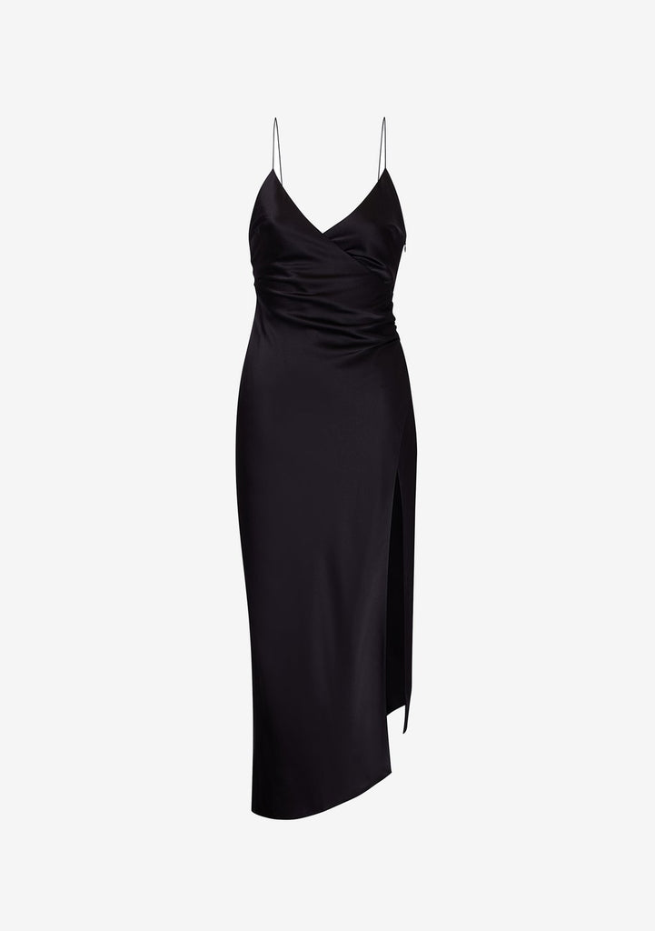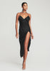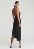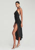 Classic silk slip dress with thigh high slit at front. Crossover straps with open back. Asymmetric hem. Hidden side zipper closure. Shown here in Black.