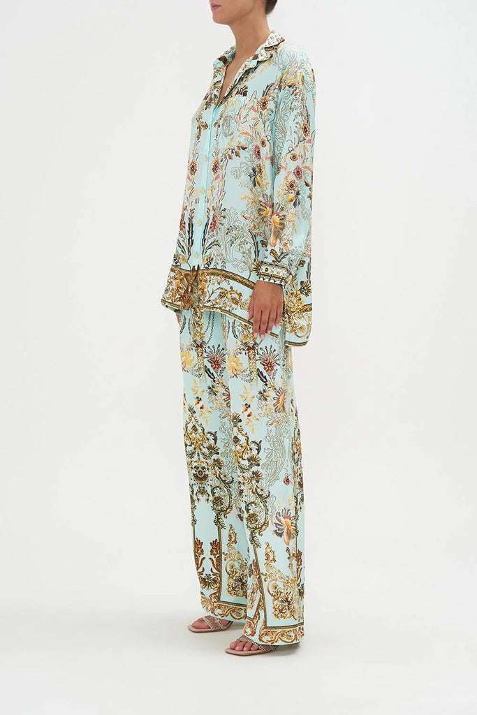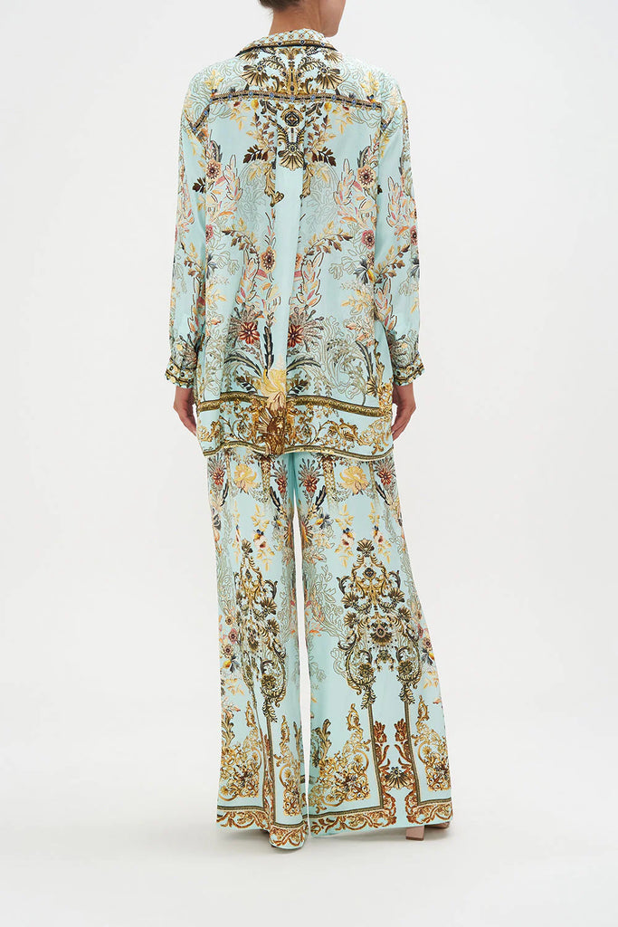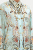 The Adieu Yesterday Single Pocket Shirt explores a mesmorising sea of celestial blue hues finished with ornate golden swirls that dance alongside decadent botanical details and exquisite chain cascades. Crafted from the softness of silk, this luxury shirt is dipped in tailored nods with a hand-embellished structured collar, gold button detailing and relaxed, oversized feel.