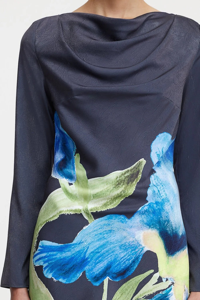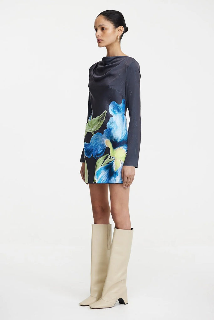 The Merida Mini Dress in Midnight Botanic is a standout piece for day or night. Crafted from crinkle-textured fabric with a striking floral placement print, it features a pleated cowl neckline and an open back with rouleaux ties for an elegant, easy fit. Style it casually with sandals or elevate it with a heel for a celebratory event.