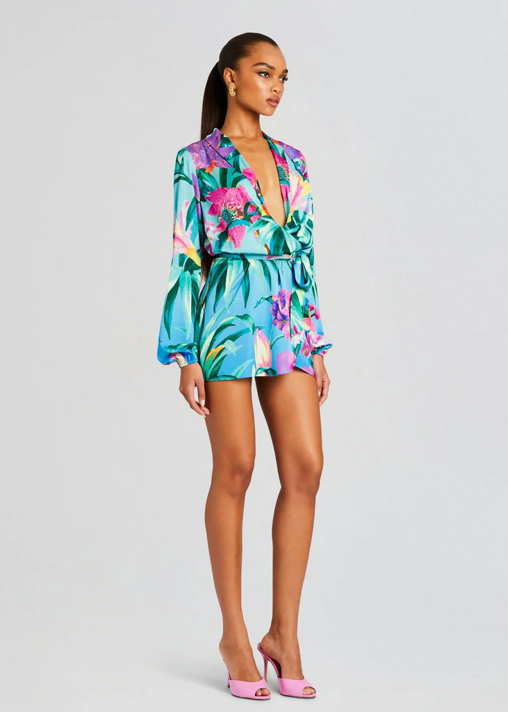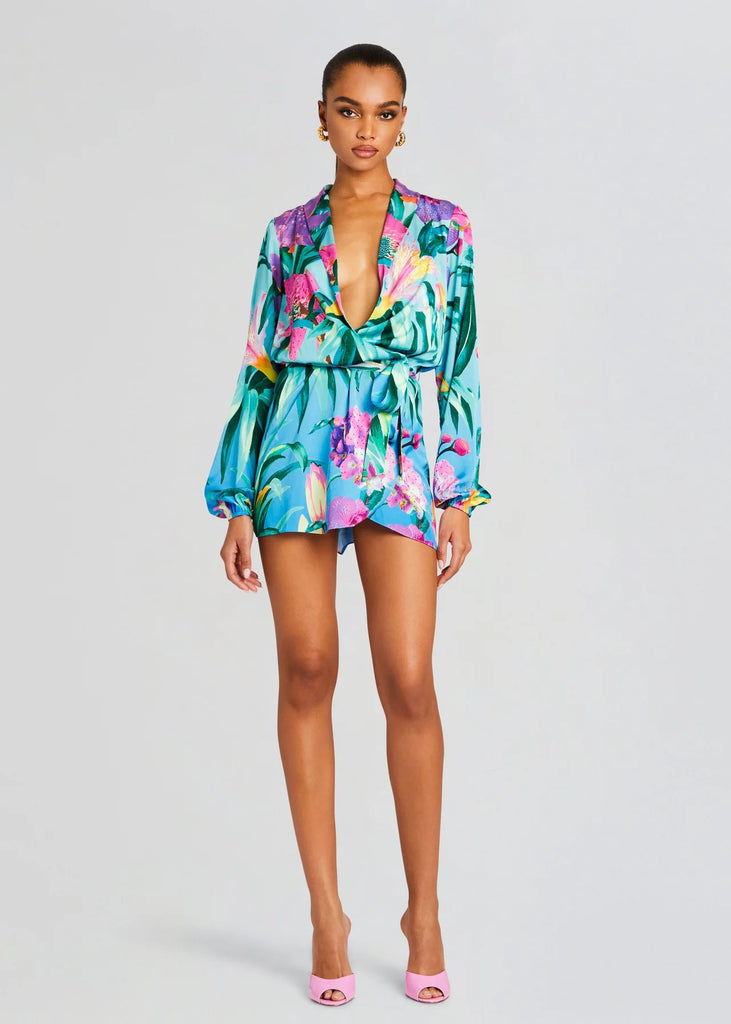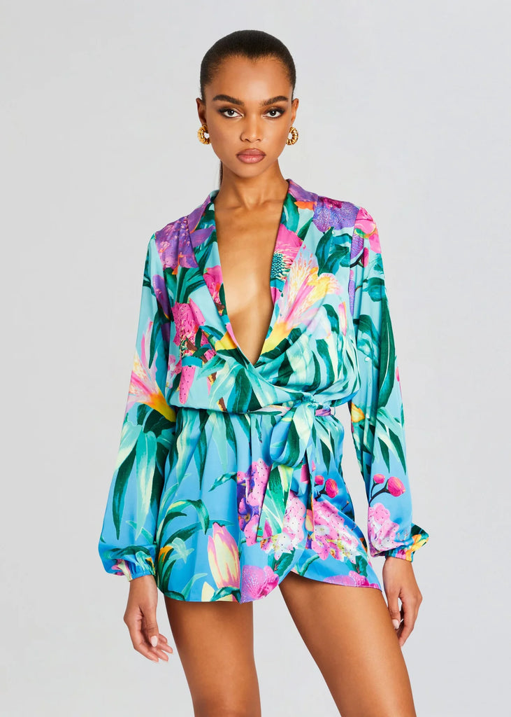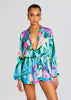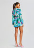 Experience the allure of paradise with Rococo Sand's Ocean Mini Dress. The asymmetrical hem creates a unique silhouette, while the balloon sleeves and collar elevate its elegance, making it perfect for any vacation. Shown here in Turquoise.