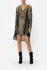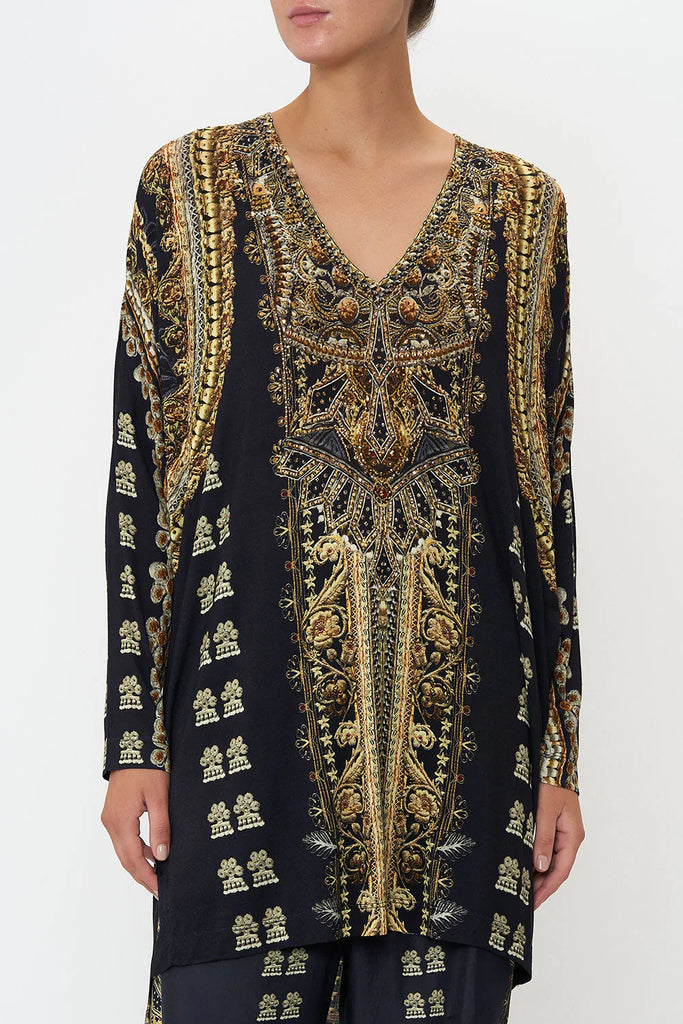 Decadently ornate for cooler moments, the It’s All Over Torero Side Split Tee captures our gaze a deep shade of midnight as rich weavings work their way around baroque detailing and subtle botanicals. Adorning hand-embellished crystals, this luxury knit features a relaxed longline silhouette, a deep v neckline, statement batwing sleeves and a high-low hemline. Take it out on the town with a boot and bare pins.