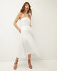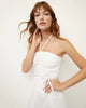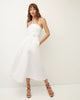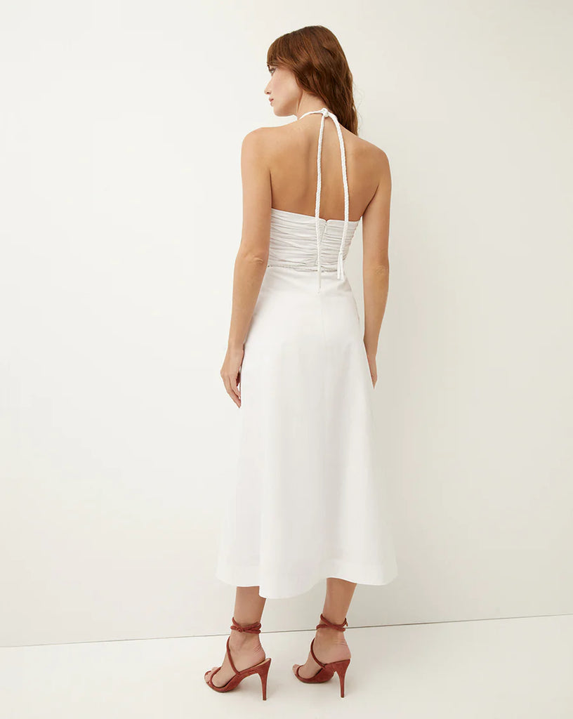 A lightweight, stretch-cotton closet hero. The Tucker is at once both versatile and glamourous thanks to its crisp, cool, cotton base along with a ruched and fitted bodice, A-line midi-length skirt, and braided trims and ties. The halter-style piece also has pockets for utility. Wear with a denim jacket for more casual outings and strappy heels and a clutch for weddings.