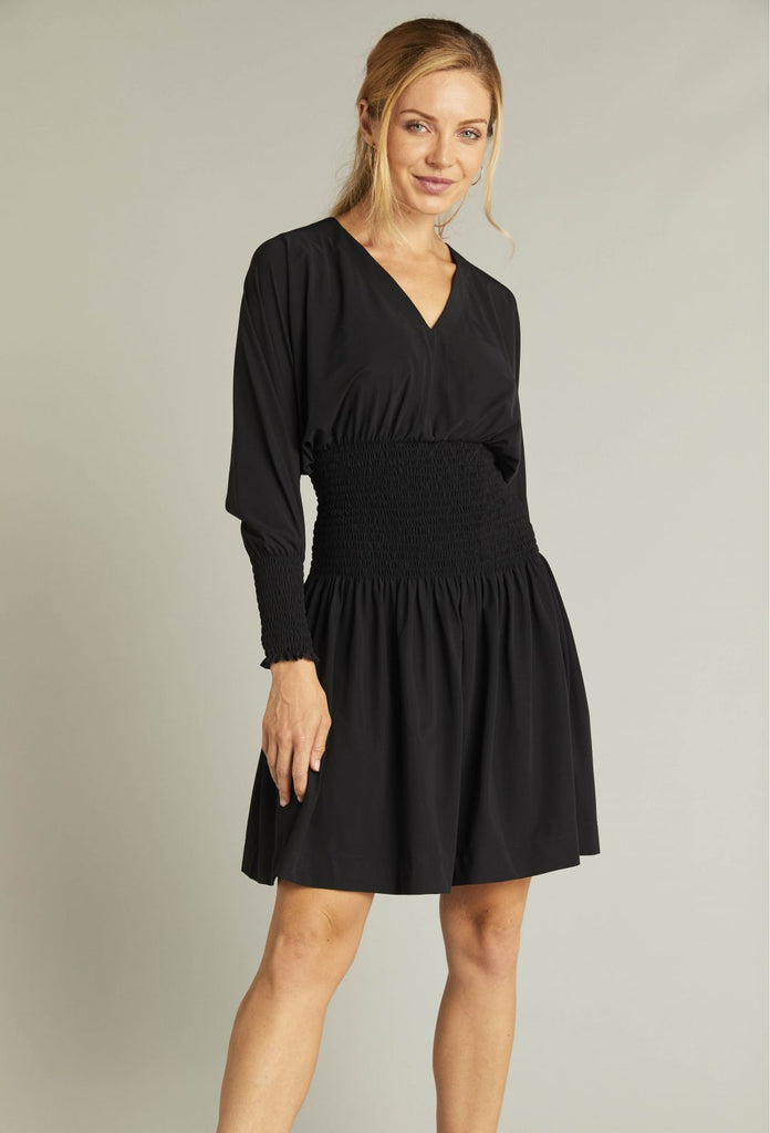 A wardrobe essential, the famous little black dress! Our Voleuse dress will charm you with its v-neck, slim fit with smocked waist and puffy sleeves with smocked cuffs. A special mention for its made in Italy fabric. Wear it with sneakers or open shoes for an all-round trendy look!