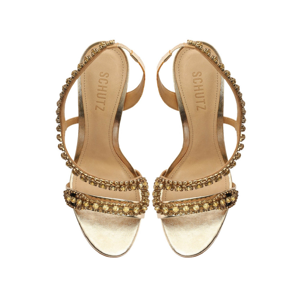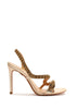 A statement-making sandal crafted from metallic leather with crystal-adorned straps and a stiletto heel.