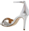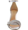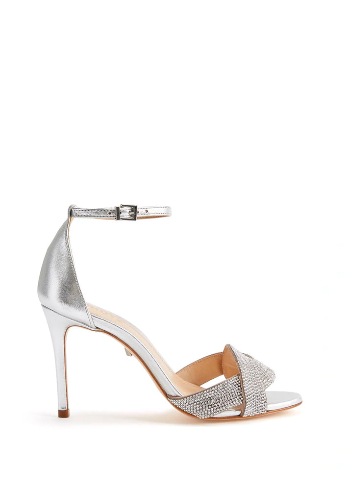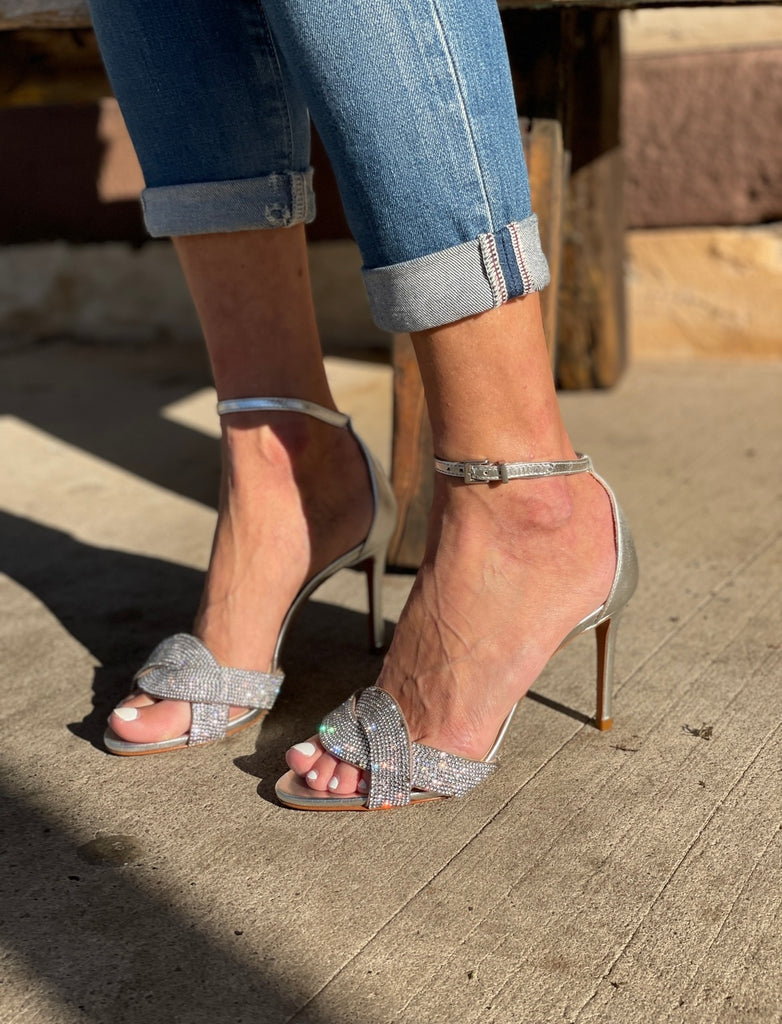 A subtly glam, high-heeled sandal with a delicate ankle strap and embellished, twisted straps over the toe. Intertwining, crystal-encrusted straps add an element of sparkle.