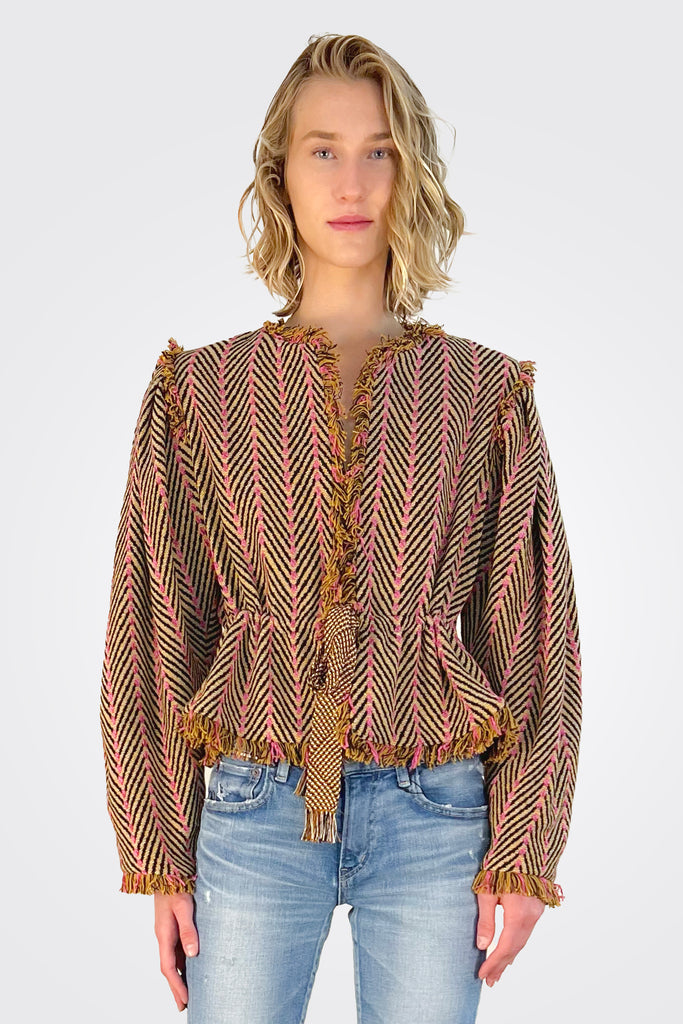 The Ames Jacket is cut from Italian herringbone tweed coating in a peplum-style silhouette. Designed in a simple collarless silhouette, this cropped jacket is detailed with contrast fringe along the seams and is finished with a long grosgrain tie at the waist.