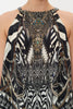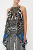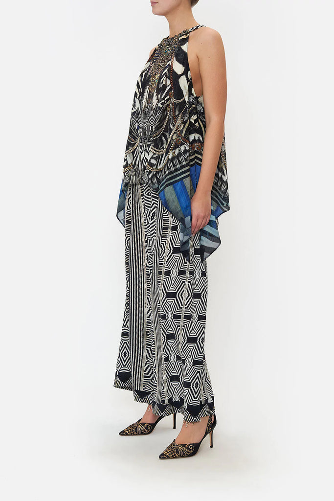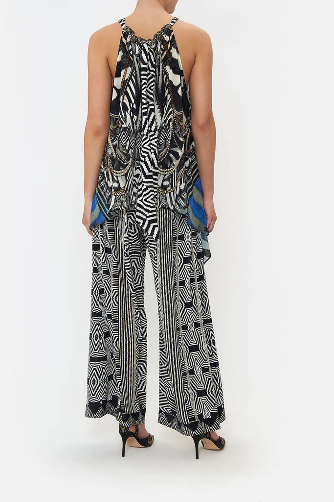 Sharp tailoring melting upon wild odes, the Knight Of The Wild Drawstring Neck Tank introduces the eye to a monochromatic zebra print dipped in metallic chain details with striking portraits and pops of royal blue hues. Crafted from exquisite CAMILLA silk, this luxury camisole features a gathered neckline, a relaxed silhouette, an intricate high-low hemline that drapes to perfection, hand-embellished crystals and key hole accents at the décolletage.
