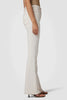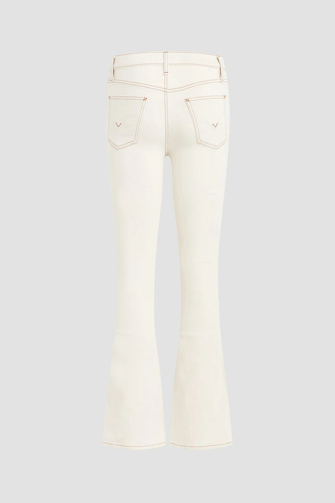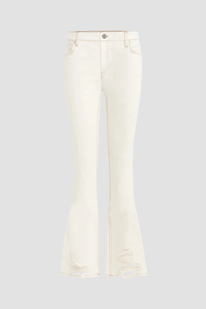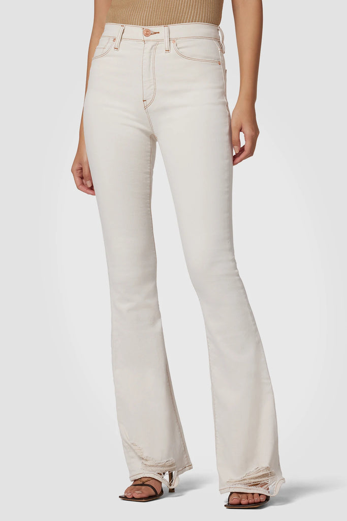 Holly High-Rise Flare Jean in Soft Ecru is cut from premium comfort stretch denim with vintage-feel distressing at the hems. Features an elevated waistline, classic five-pocket details, and a fitted leg that breaks at the knee.