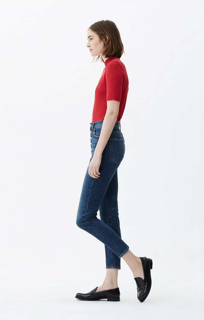 A step above our standard slim, the Olivia features a high rise and ankle length. The new Fall fit is crafted from comfort stretch denim, offering an authentic look with effortless wearability. The Circa wash is a medium blue indigo with an exposed button-fly.