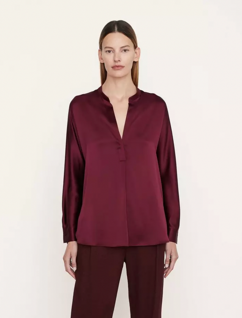 A seasonless essential that's big on vision, our utterly sleek blouse is crafted in knockout silk with a crisp band collar.