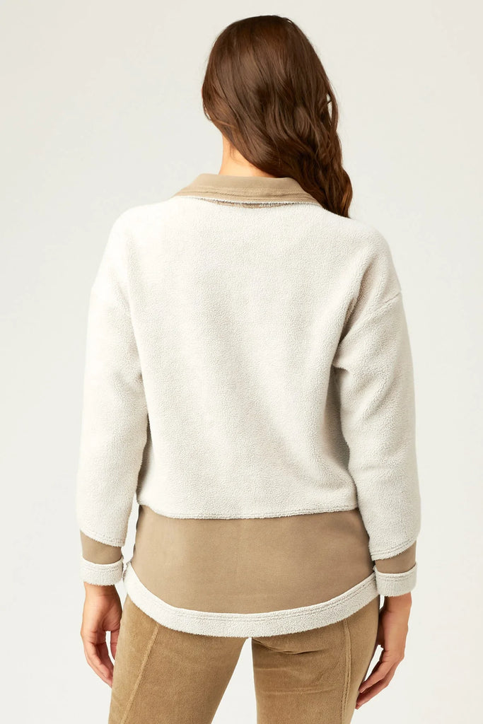 Sherpa one way and sherpa another way! Patchwork design lends it hand to this quirky piece with both sides of our twill backed sherpa on display. Arlo features patch front pockets and contrasting patches throughout.