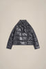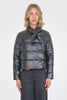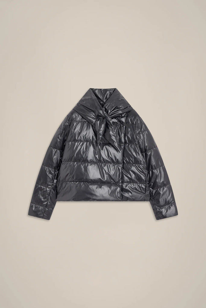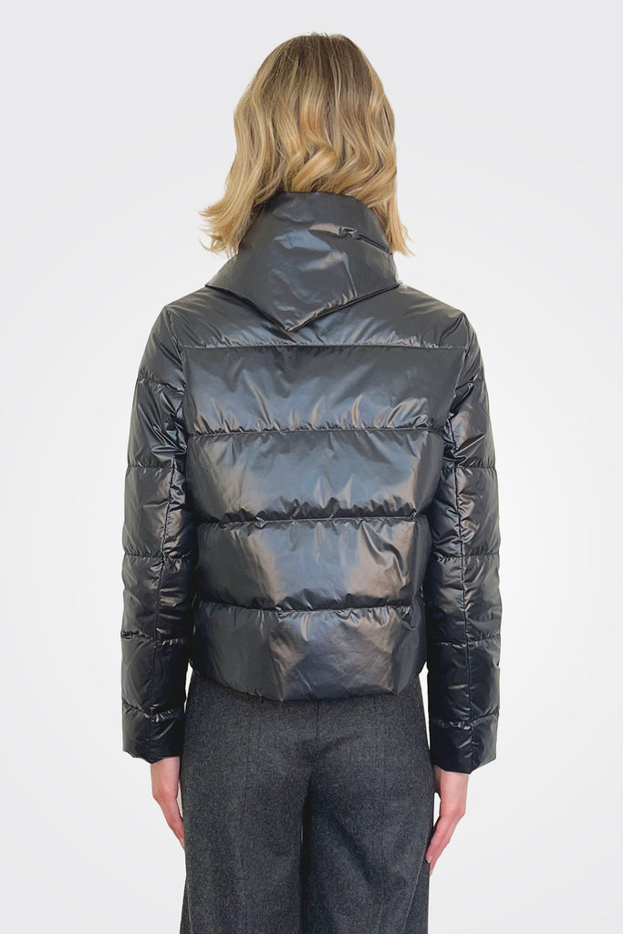 Quilted down jacket in light nylon fabric, real goose down filling, crew neck with magnetic closure on the side, pockets inserted along the sides, matching padded scarf in the same fabric.