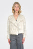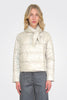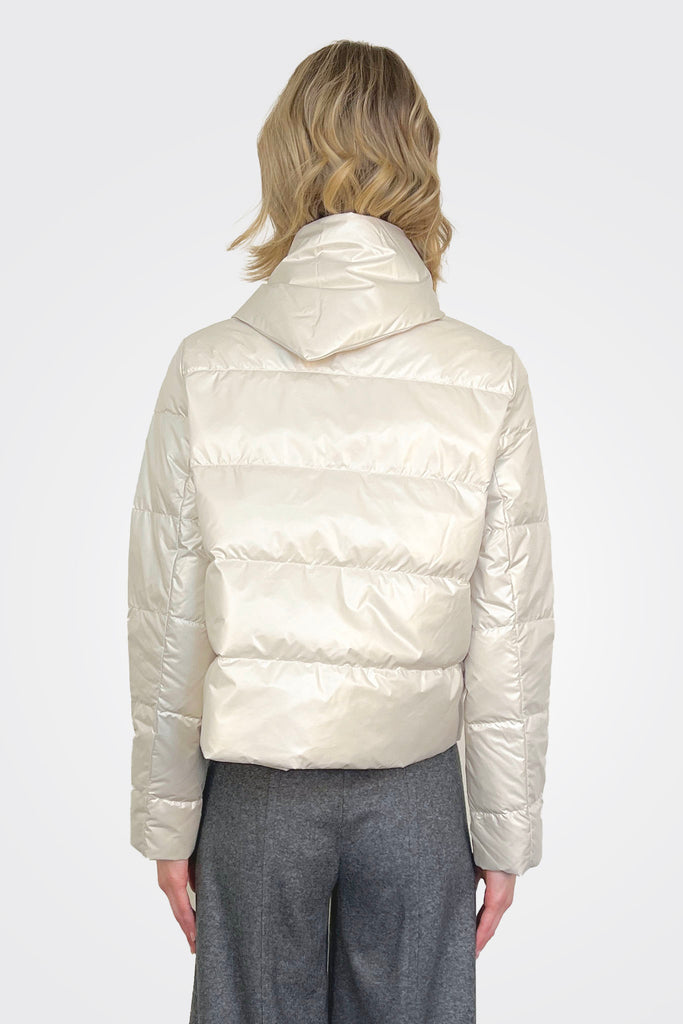 Quilted down jacket in light nylon fabric, real goose down filling, crew neck with magnetic closure on the side, pockets inserted along the sides, matching padded scarf in the same fabric.