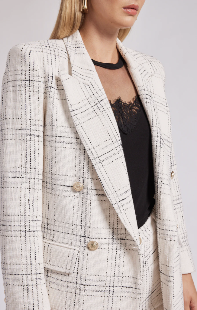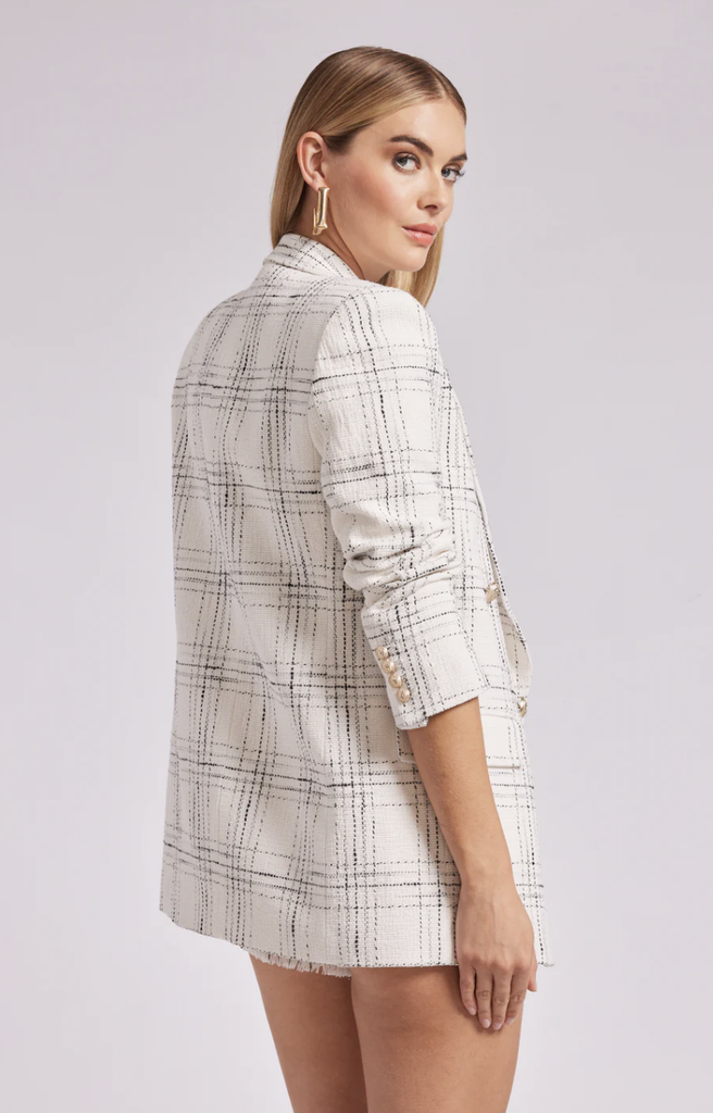 Go classically preppy in the Talan. Made with our crafted tweed, a double breasted design and gold buttons, this timeless blazer will pair perfectly with all your favorite trousers and jeans for work or the weekend. Generation Love’s tweed is crafted with recycled fabric.