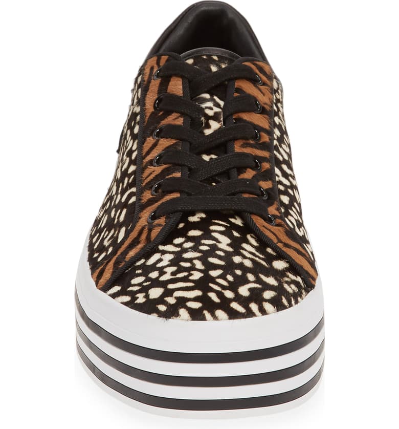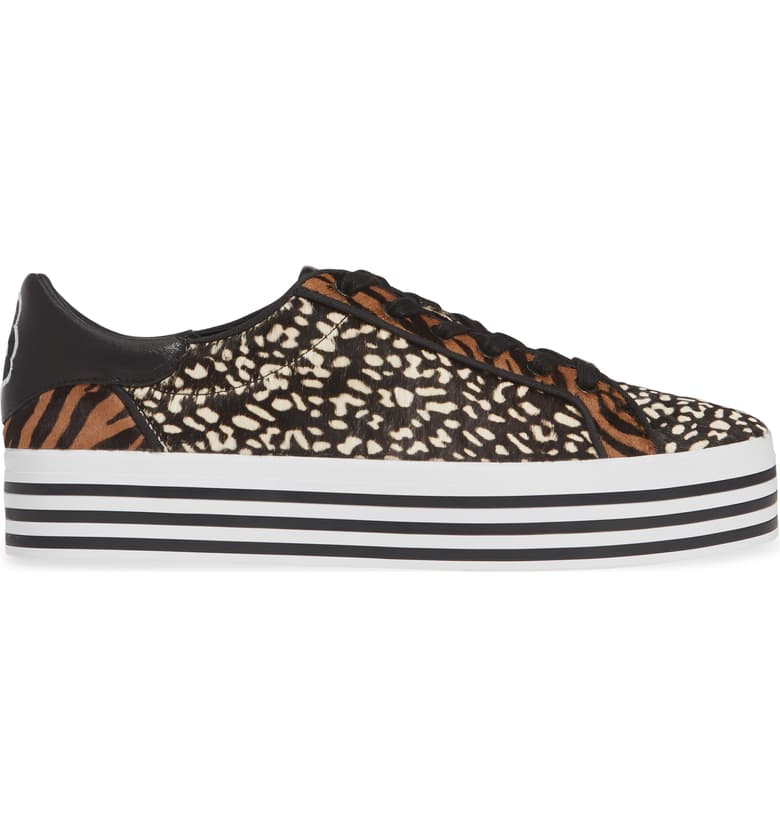 A combination of plush calf hair, leopard spots and stripes makes this platform sneaker a style standout.