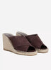 Supple Spanish suede crossover straps have an elongating effect in this peep-toe wedge, finished with an espadrille heel.