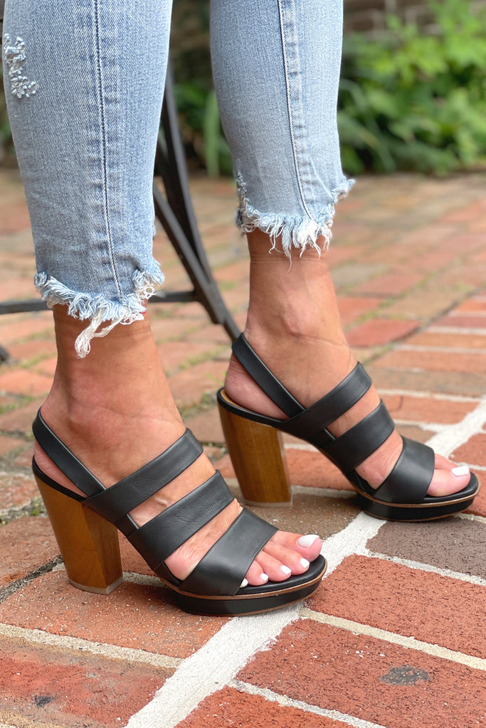 A three-strap slingback platform sandal with a solid wood sculpted heel in a colored leather.