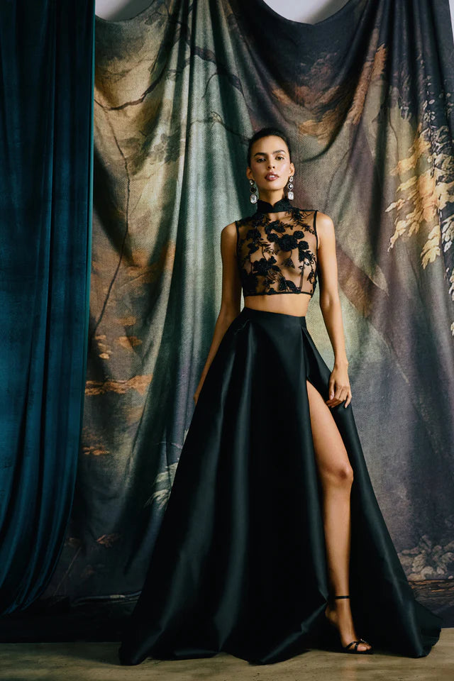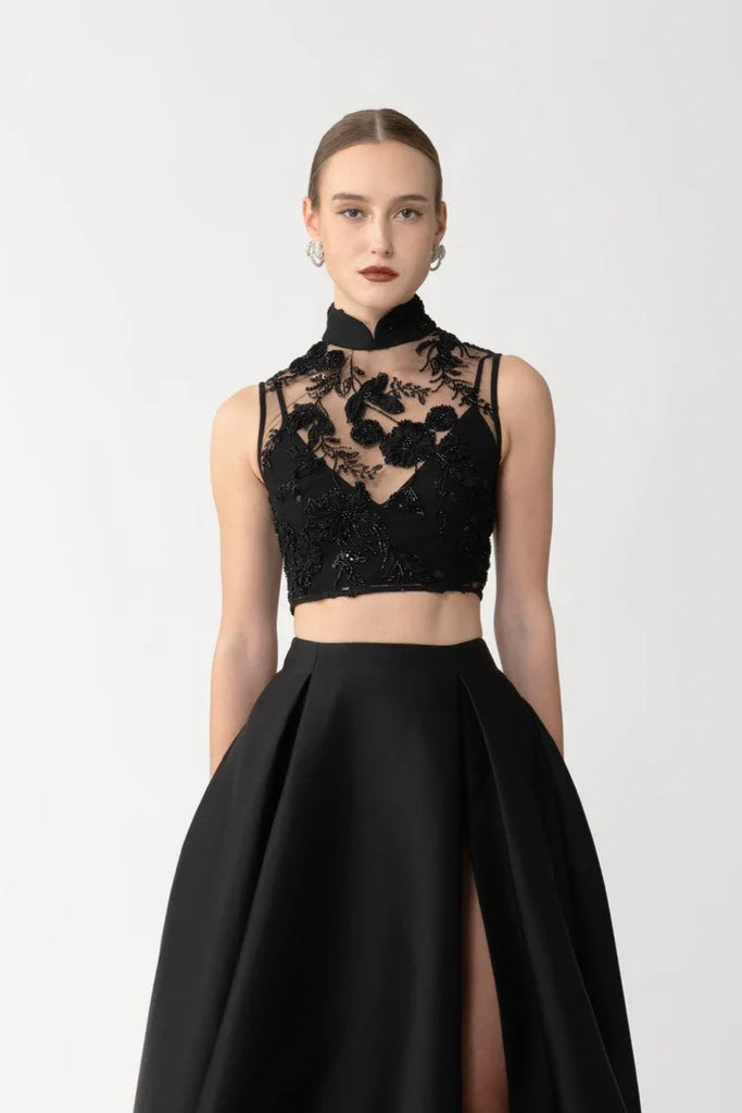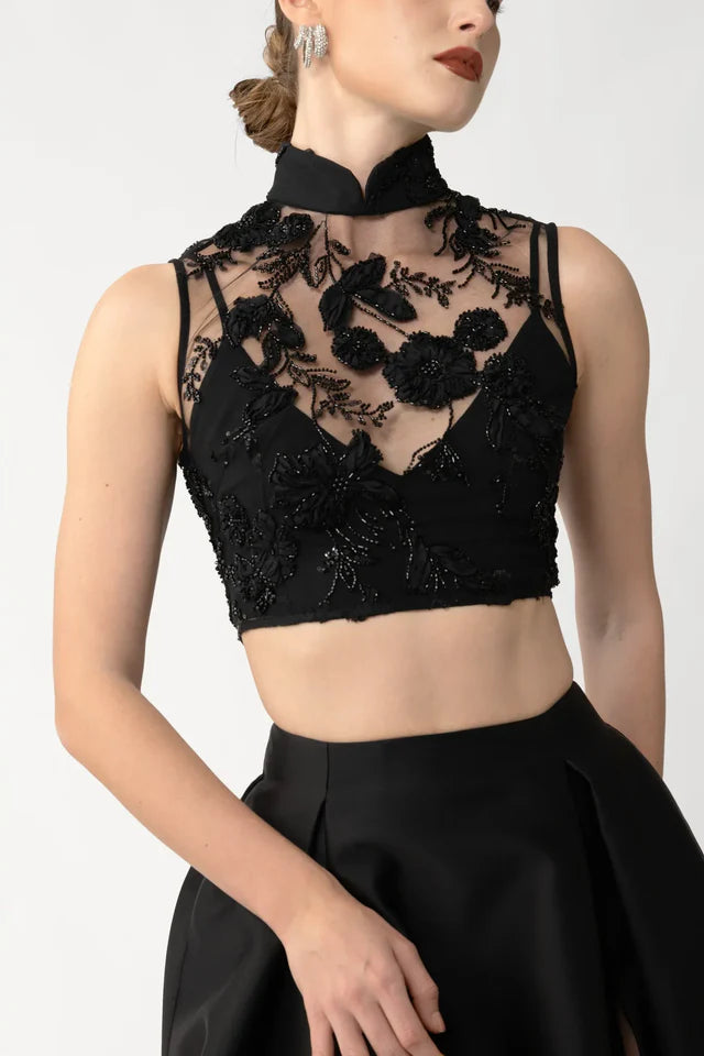 The Skye Top is crafted from mesh and beaded with floral sequins, and features a mandarin collar and cheongsam-inspired cut. Comes with a separate lining.