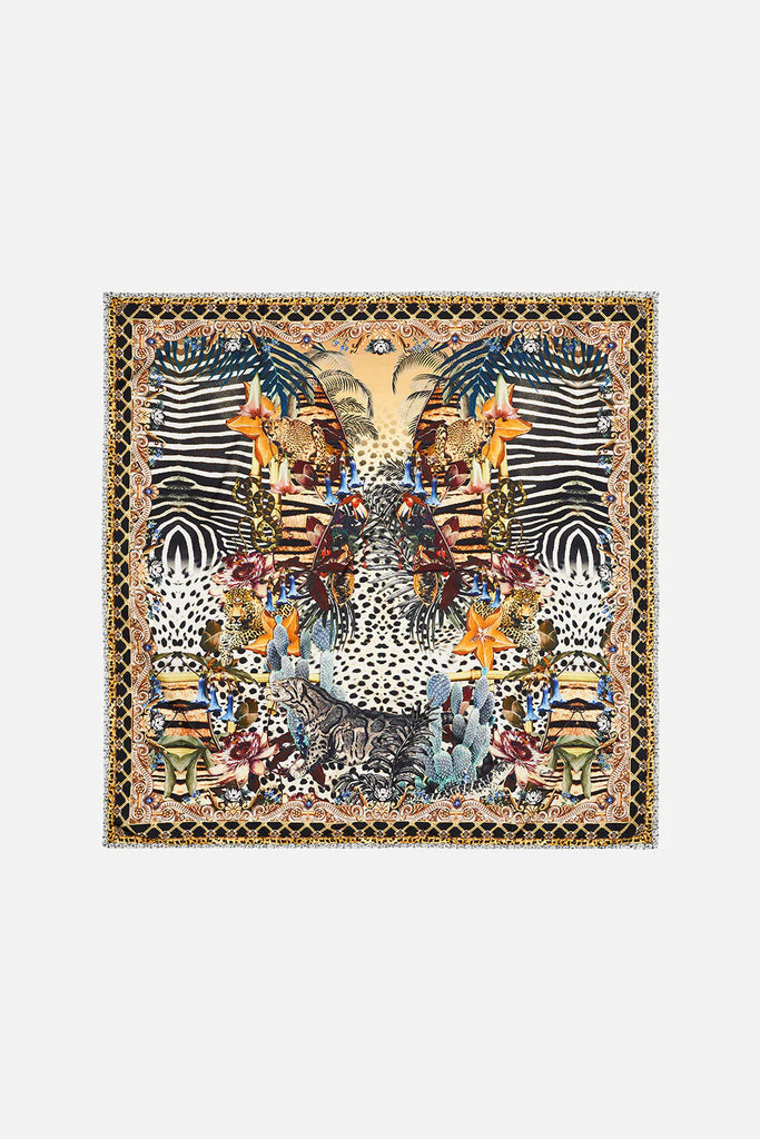 Inviting intrigue to the décolletage with the wilds of Mother Earth, our Natural Instinct Large Square Scarf captures the gaze with sunset scenes defined by stalking cheetahs, violet-infused bluebells, forest ferns and the striking stripe of the zebra. Hand-embellished with crystal adornments, this luxury silk scarf features a large expanse, contrasting trim, signature CAMILLA shimmer and a multi-wear design.