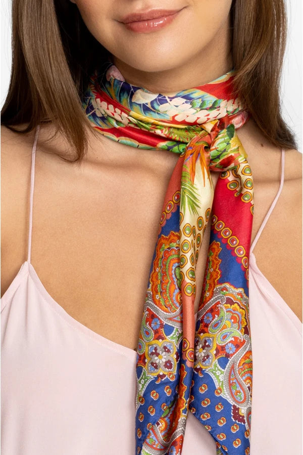 Akin to a work of art, the Rapsodia Scarf seamlessly combines a vintage selection of blooms with an intense color palette. A stylish year-round accessory, this luxe scarf is designed from sumptuous silk and boasts a bold patterned border complete with a romantic floral arrangement in the center. Style this piece as a head scarf or opt for a timeless look by tying around the neck.