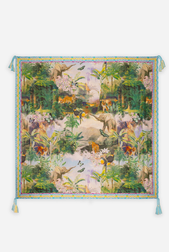 Detailed and serene, the Rawi Silk Scarf features a picturesque landscape scene adding a pop of creativity to your look. Crafted from 100% silk, this unique scarf has been thoughtfully constructed to be easily tied making it a versatile accessory. Tie at the neck or add to the handle of your favorite bag for an eye-catching splash of color.