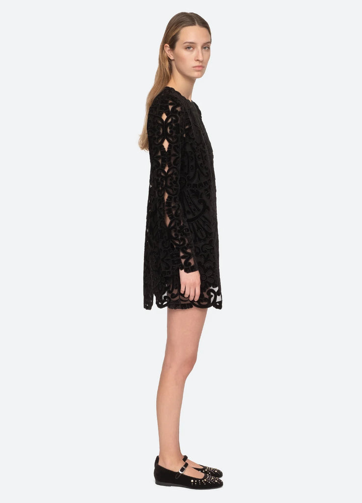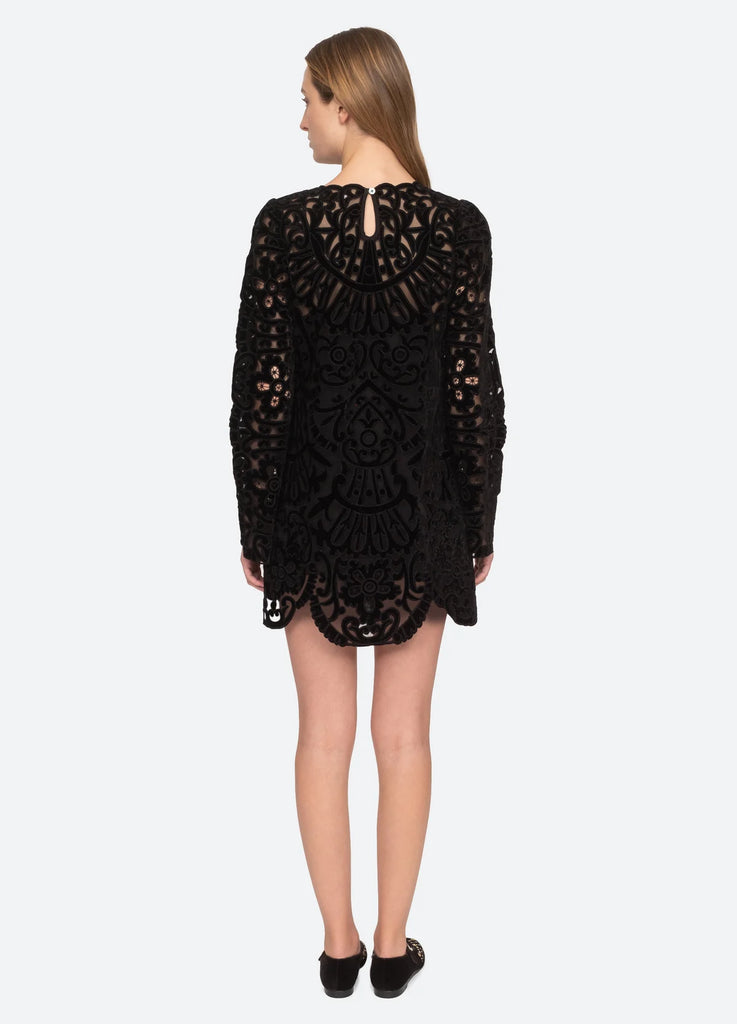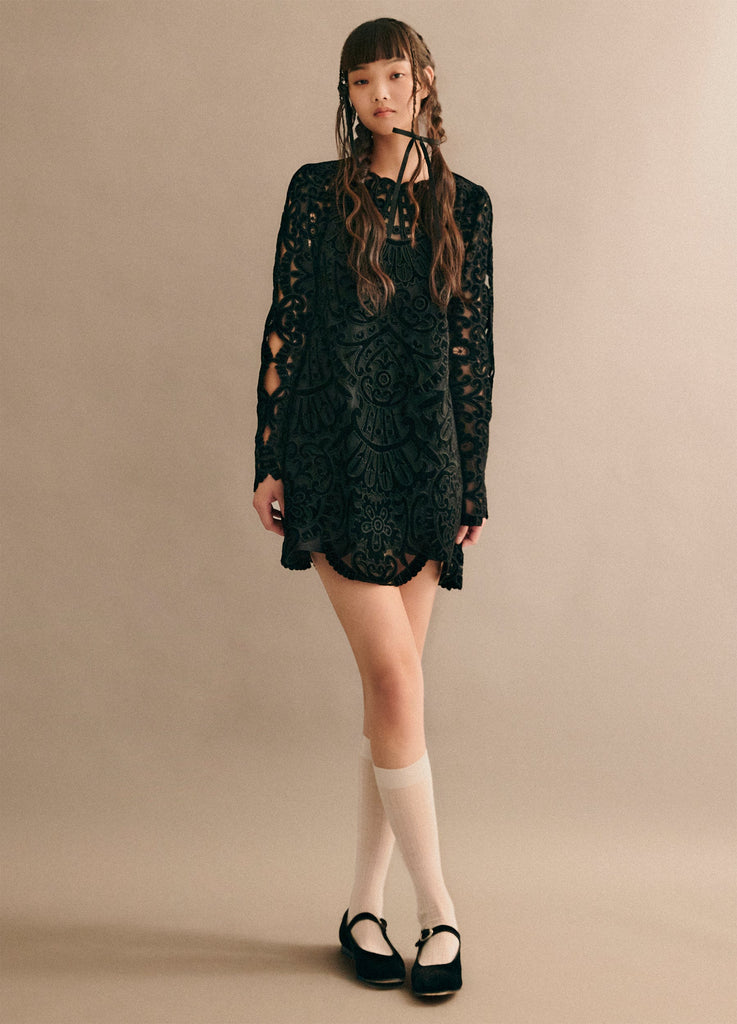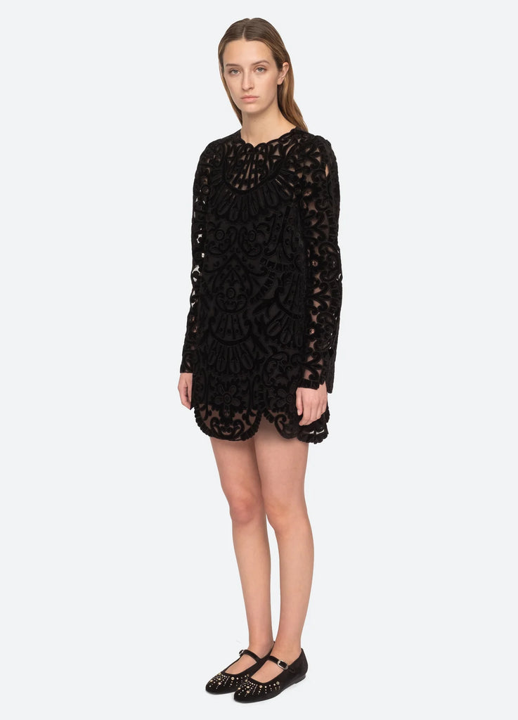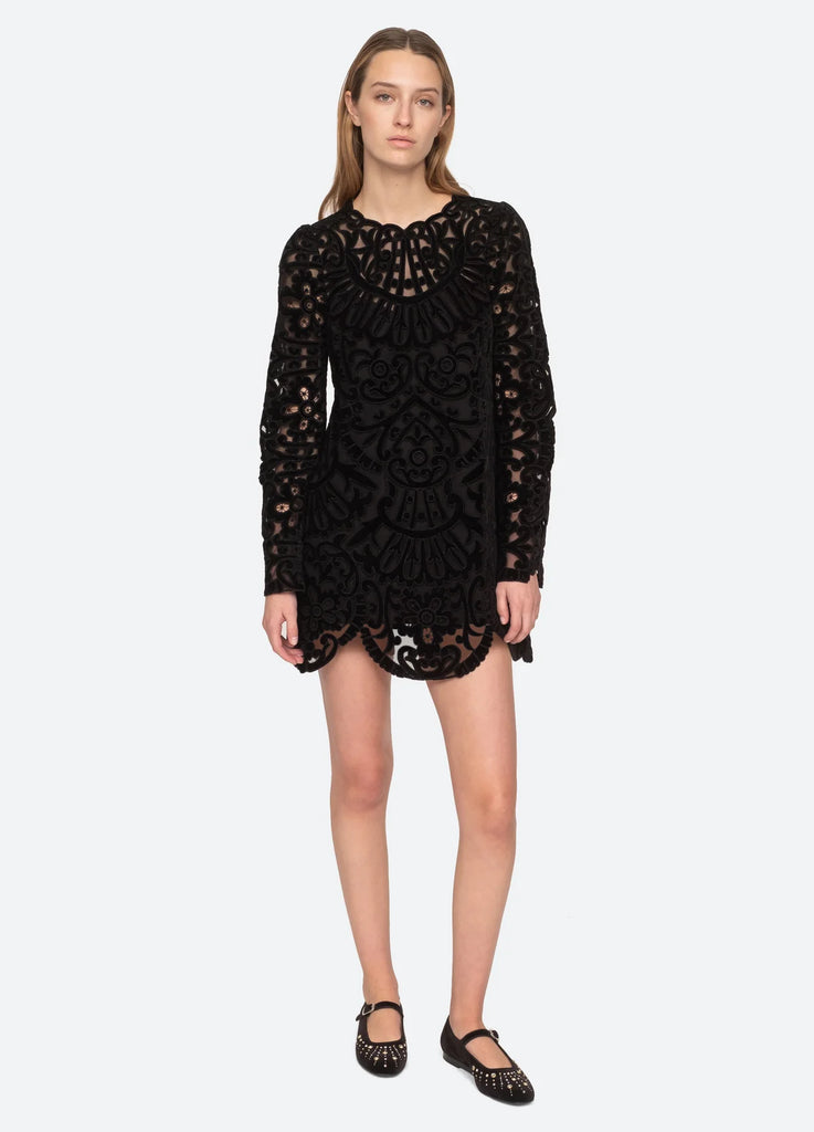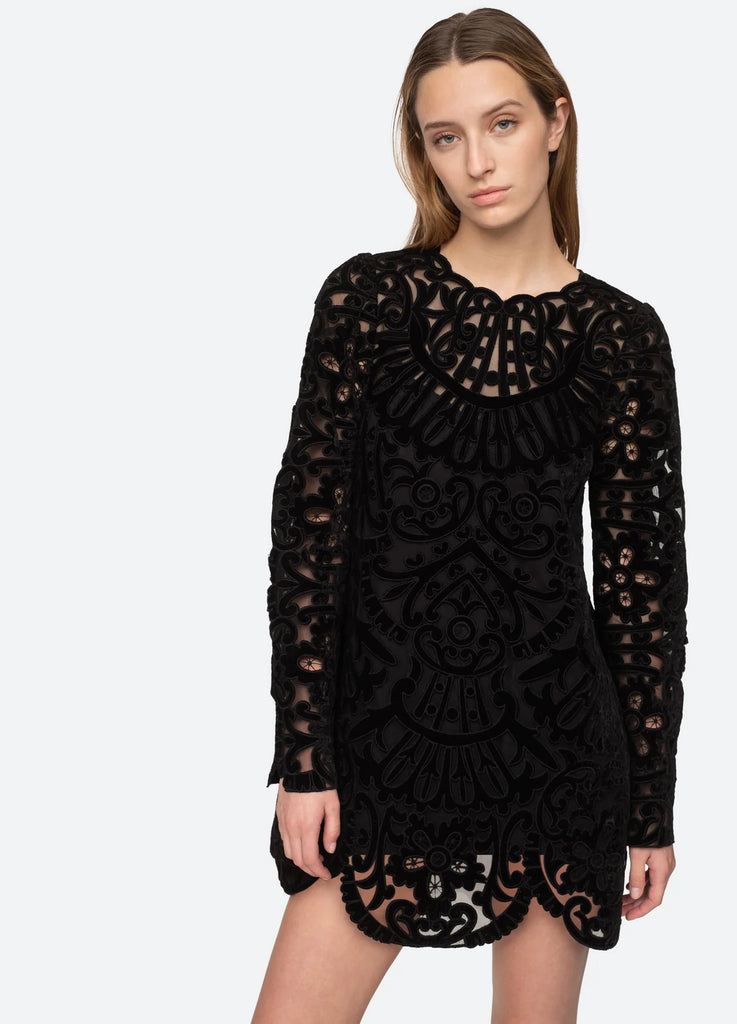 Romantic Dana long sleeve embroidered velvet dress features intricate embroidered detailing and long sleeves with cutout accents.