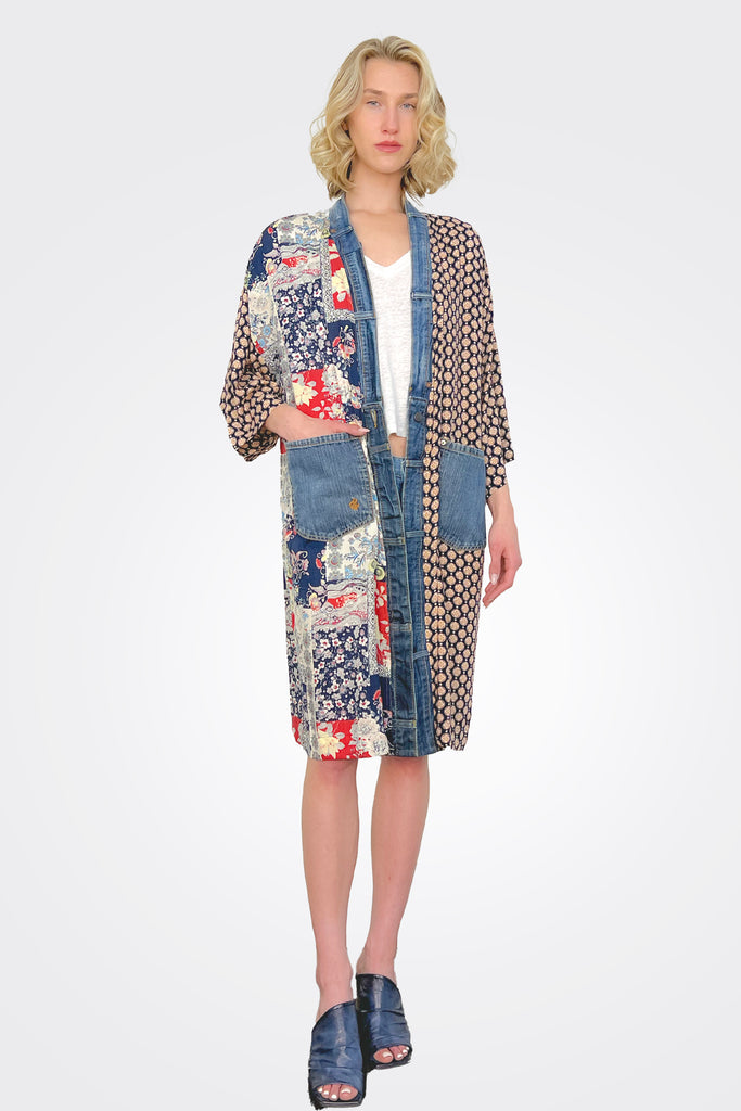 The Janis Cardigan by Shannon Passero. Crafted from eclectic mix of fabrics and designed with an extra long length, this lightweight cardigan will keep you warm without weighing you down! Perfect for those breezy days when you need just the right touch of layers. Get wrapped up in the Janis! Trimmed with denim!