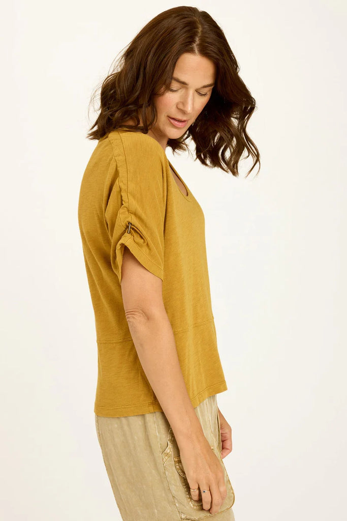 Ashla features a wide, dipped neckline and elongated sleeves with adjustable ruched channels. Unique seaming and soft, stretchy jersey material finish off this unexpectedly-detailed upgraded tee.