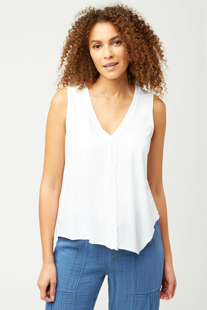 Asymmetric high-low hems are all the rage in the Lazzaro Tank. V-neck and raw-edge details round out this fun top.