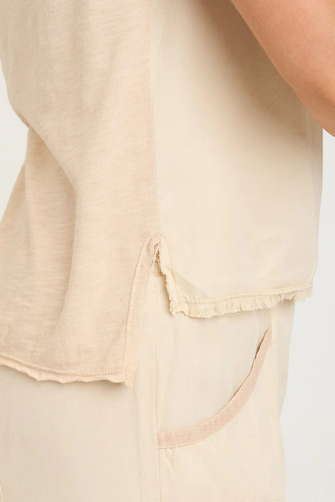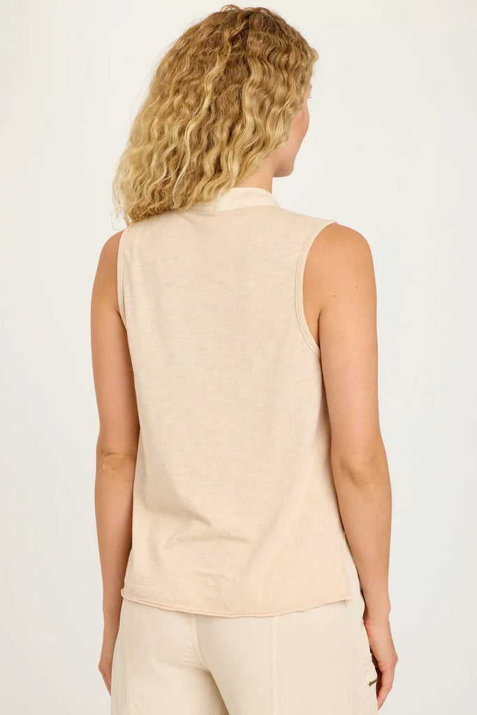 Small breast pockets, a stand collar, and raw-edge hemming bring subtle detail to the Mikkel Tank in our plush Soft Twill.