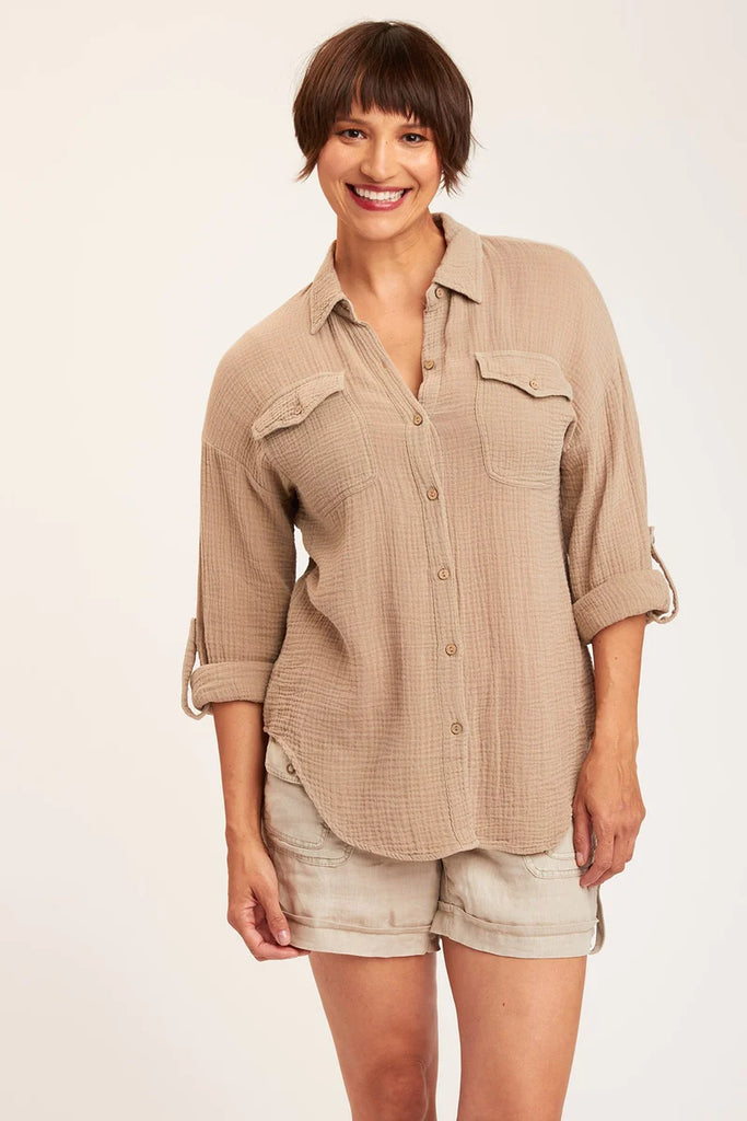 Buttoned up and ready to rock, Wendell has a dropped shoulder into a long sleeve that rolls up into a tab attached by coconut buttons. Higher cut side seams amplify the high low hem of this style.