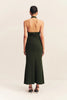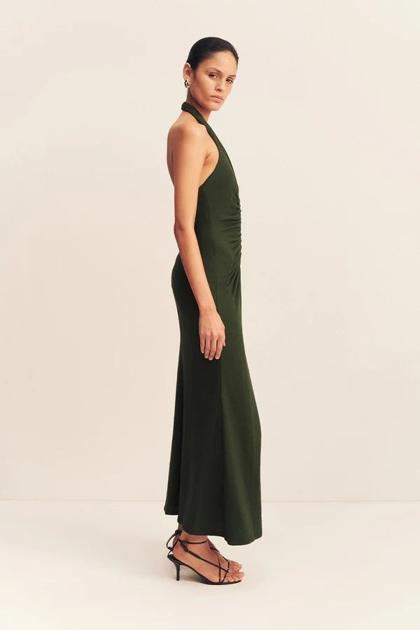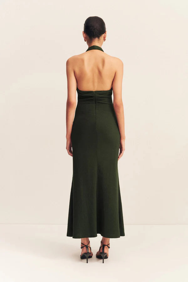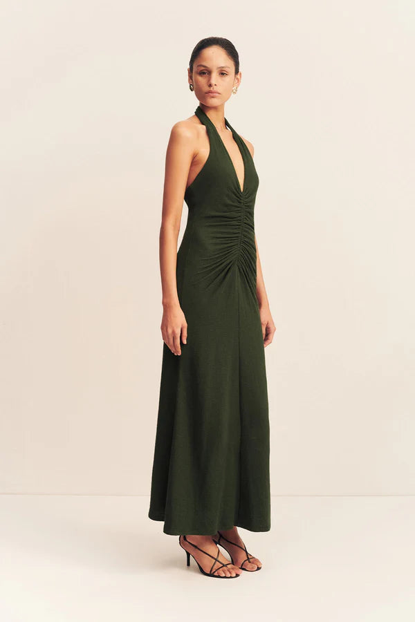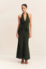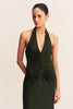 Halter ruched maxi dress in army green in a soft cotton jacquard.