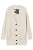 Cardigan knitted with a very light grey yarn that makes a small bouclé with a contrasting black intarsia detail on the back. It fastens with contrasting black buttons. It has a wide and long fitting, reaching to the hip. The gauge of the knit is 8.