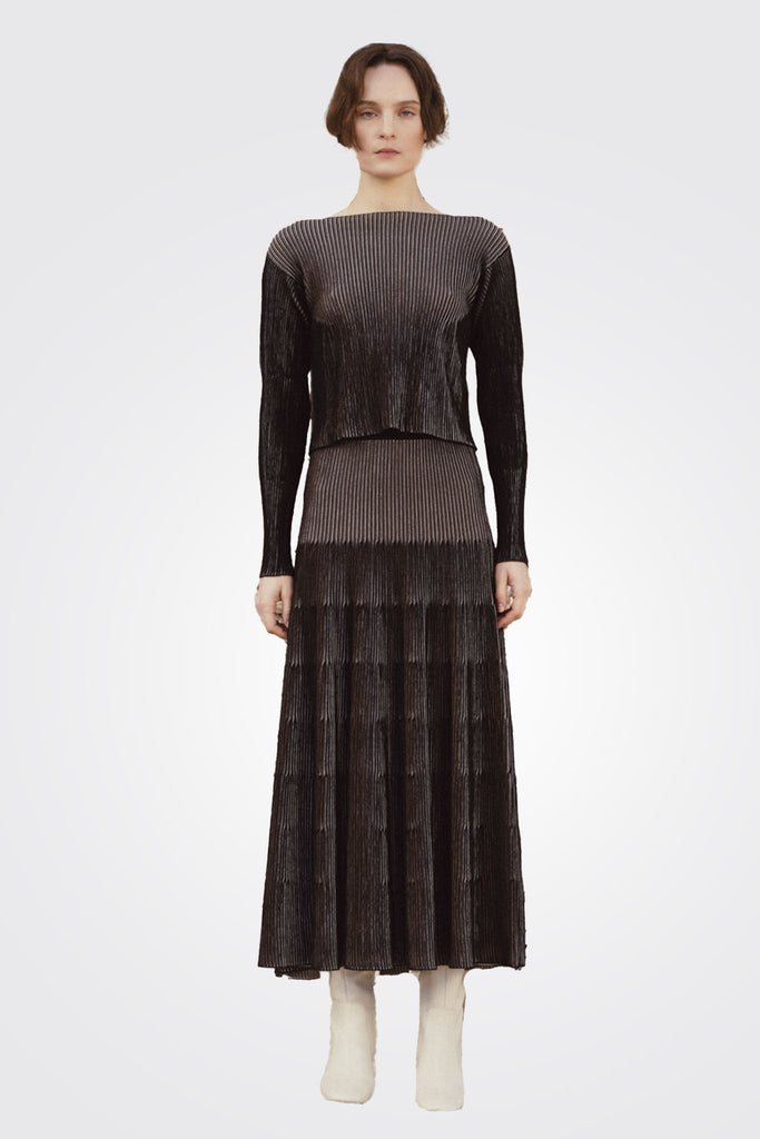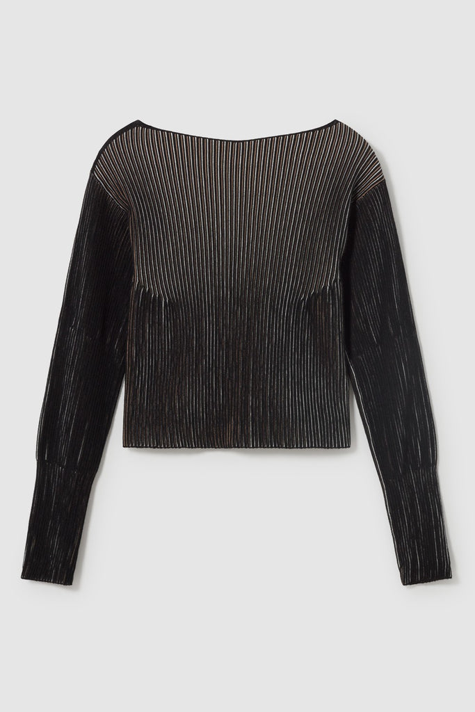 Seamless little sweater with boat neck. It is striped vertically in three colors and with links structure that gives the garment an iridescent effect. This garment is knitted in gage 14 in Igualada.Igualada