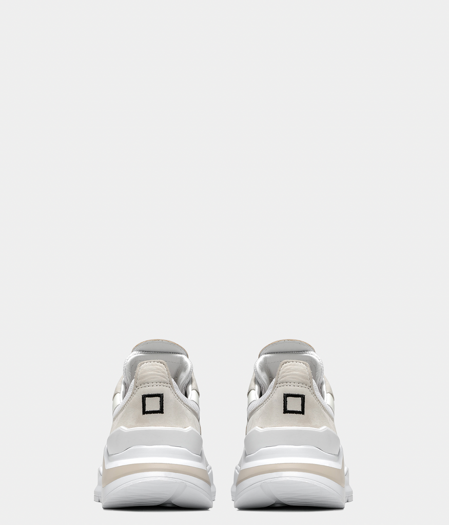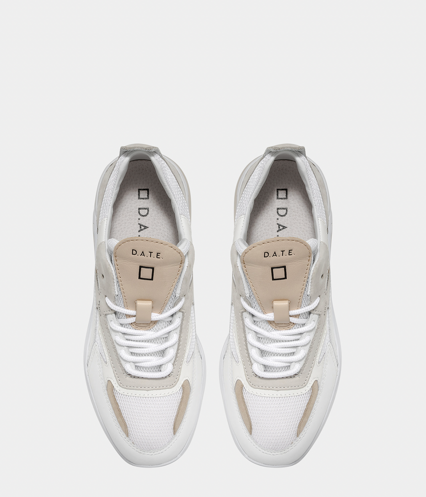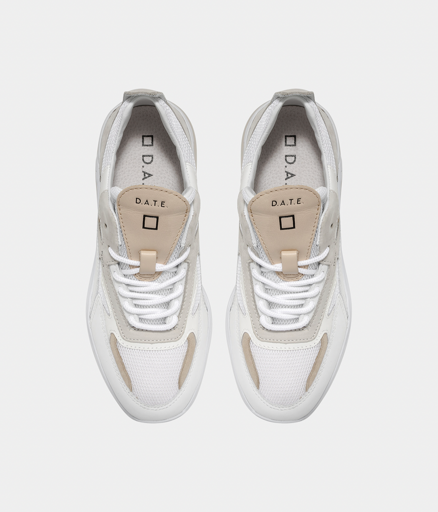 Running Sneakers in white mesh with color matched inserts in leather. Details in beige nubuck leather and natural leather color suede. Natural color leather patch with logo and DATE lettering seamed at tongue. Embossed FUGA lettering at side. Round laces and embroidery square logo at back. Leather and cotton terry lining. The 2.5 cm-high raised gel insole allows for optimal comfort. 2-5 cm high sole in Blowtech rubber. All materials used are Made in Italy.