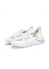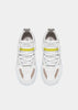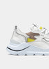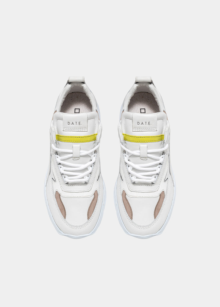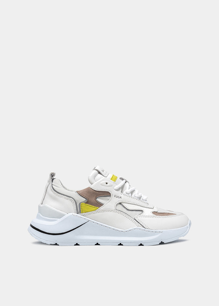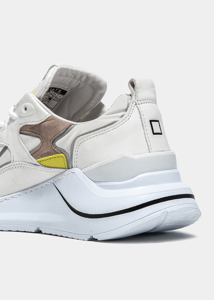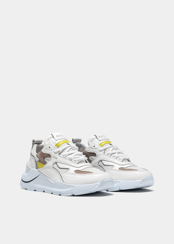 Running Sneakers in reflective white nylon with white leather and hazelnut brown nubuck leather inserts. Yellow leather details. Thermo-adhesive profiles color silver. White leather patch with D. A. T. E. lettering seamed at the multi-layer tongue. Embossed FUGA lettering at side. Round laces and square logo print at back. White leather tongue. Leather and cotton terry lining. 2.5 cm-high raised sockliner in gel for improved comfort. 2-5 cm high sole in Blowtech rubber. All materials used are Made in Italy.