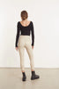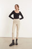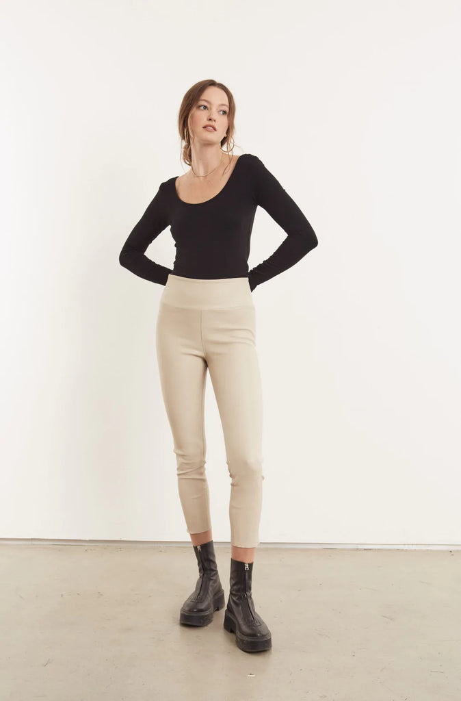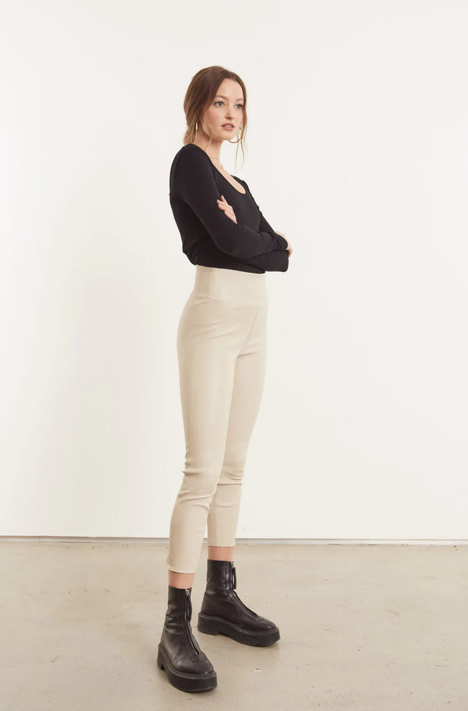 High-waisted cognac leather Capri leggings. Stretch Leather. Pull on leggings with elastic waistband. Raw hem.